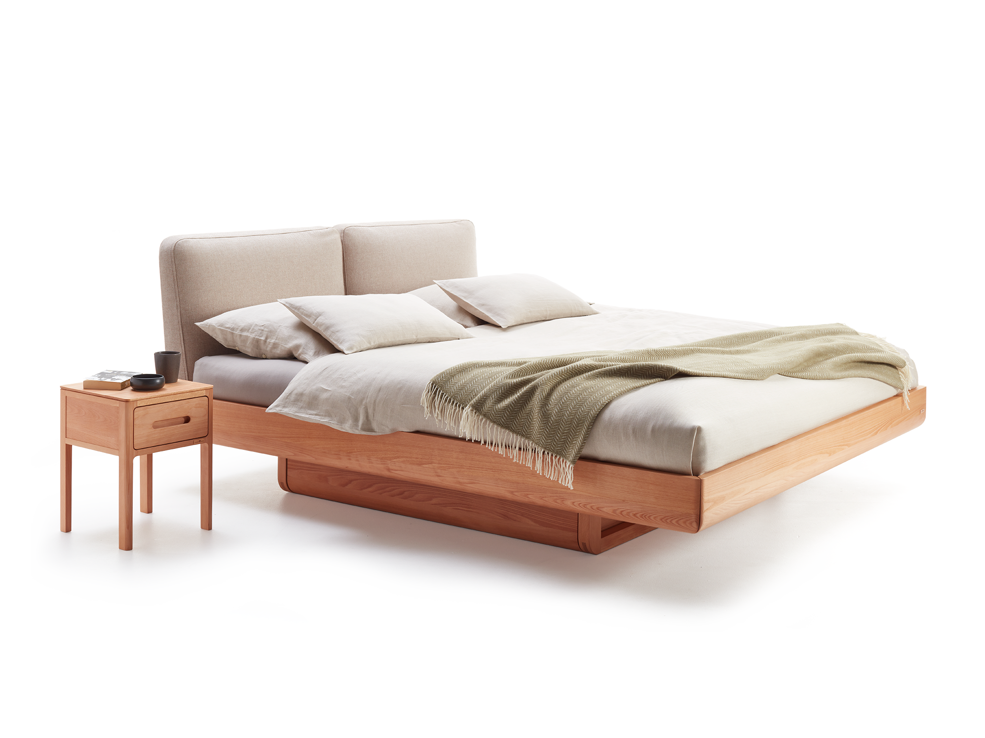Die Polsterbetthäupter lehnen lose an einem mit dem Bettkorpus fest verbundenen Holzbügel, lassen sich daher (einzeln) hochkant stellen – für noch mehr Komfort beim Lesen oder Frühstücken im Bett. Die „Gefahr“ dabei: Man kommt tagelang nicht aus dem nestartige Geborgenheit schenkenden Bett heraus ...