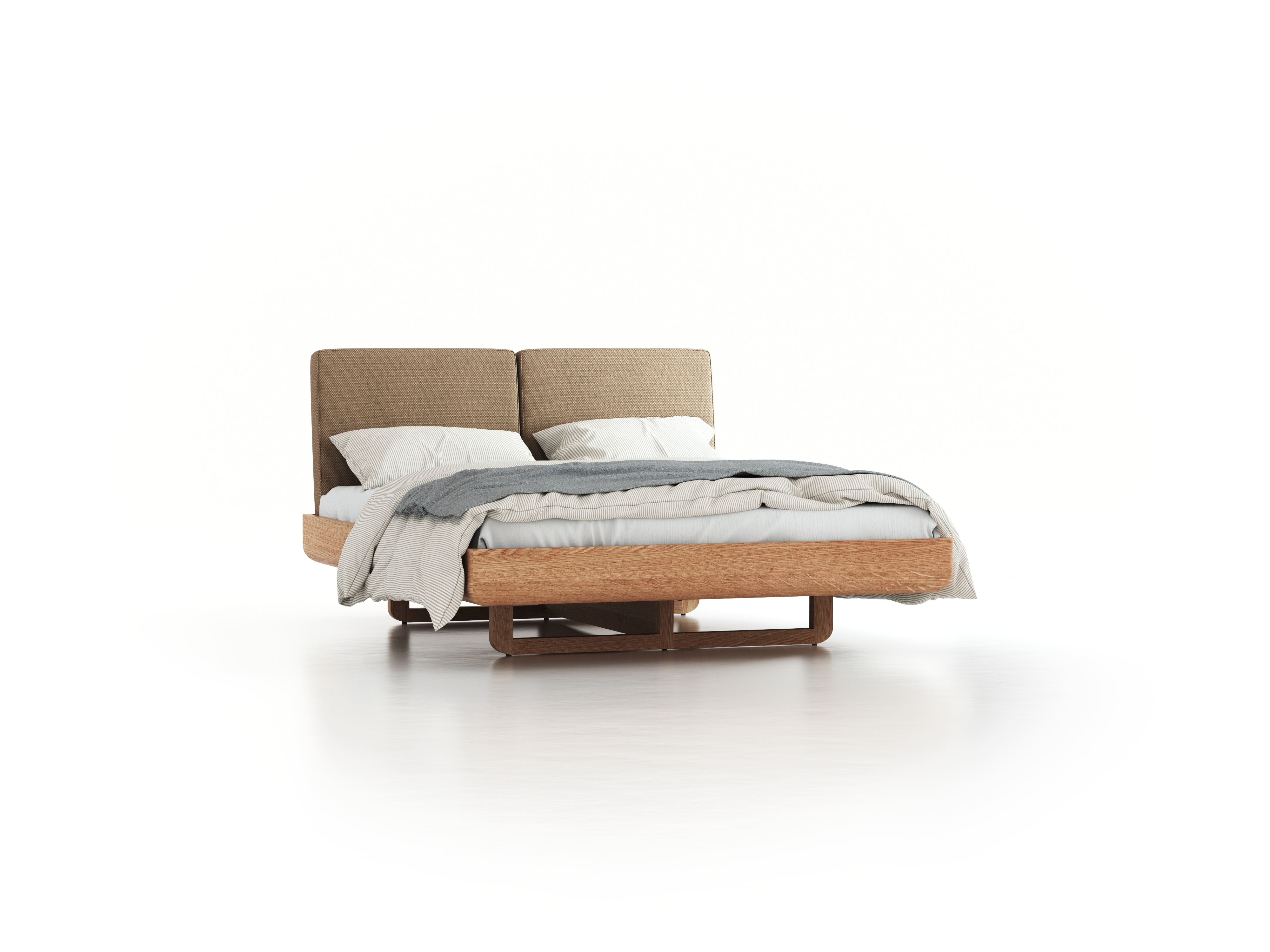 Die beiden nach innen versetzten, kaum sichtbaren, kufenförmigen Fußgestelle und das abgerundete Profil des Bettrahmens verleihen Almara eine abgehobene, schwebende Anmutung. Es ist unser bequemstes Bett. Das liegt auch an den großzügen Polsterbetthäuptern, die so komfortabel gefertigt sind wie unsere Sofas und Matratzen: kleiner betriebsinterner Know-how-