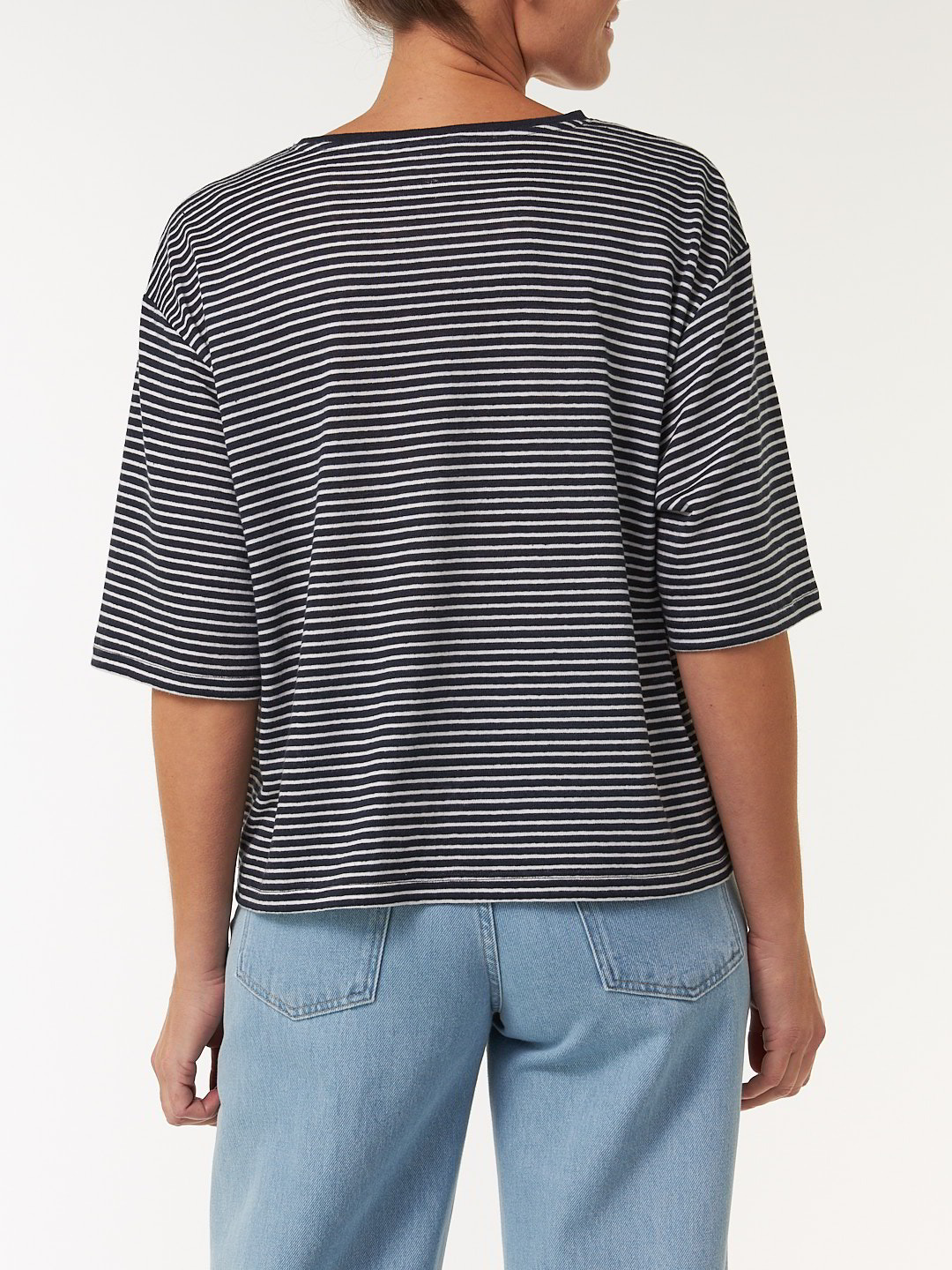 Zeitlose Ringel, reine NaturLässig geschnittenes Loose-Shirt in hochwertiger Leinen-Baumwoll-Jersey-Qualität. Die feine Ringel-Dessinierung erhält durch eine kontrastfarbene Halsleiste einen modernen Akzent. Mit überschnittenen Schultern und kurzärmeligem, sehr legerem Schnitt entsteht ein besonders entspannter Look mit natürlicher Leichtigkeit.Schnitt: sehr leger. In Größe S (36/38) ca. 55 cm lang. Unsere Models sind zwischen 175 cm und 177 cm groß und tragen Kleidergröße 36.Ökologisch & fair produziertEin schönes Stück Natur, welches wir nur zu gern tragen. Dieses Kleidungsstück entsteht aus Leinen kbA in Kombination mit Baumwolle kbA und wird nach strengen Richtlinien – wie dem Global Organic Textile Standard – bei unserem Partnerbetrieb gefertigt.Material: 68 % Leinen, 32 % Baumwolle.Materialherkunft: Leinen kbA aus Frankreich und Belgien. Baumwolle kbA aus Indien. Gewirkt in Litauen. Gefertigt in Litauen nach dem strengen GOTS. -