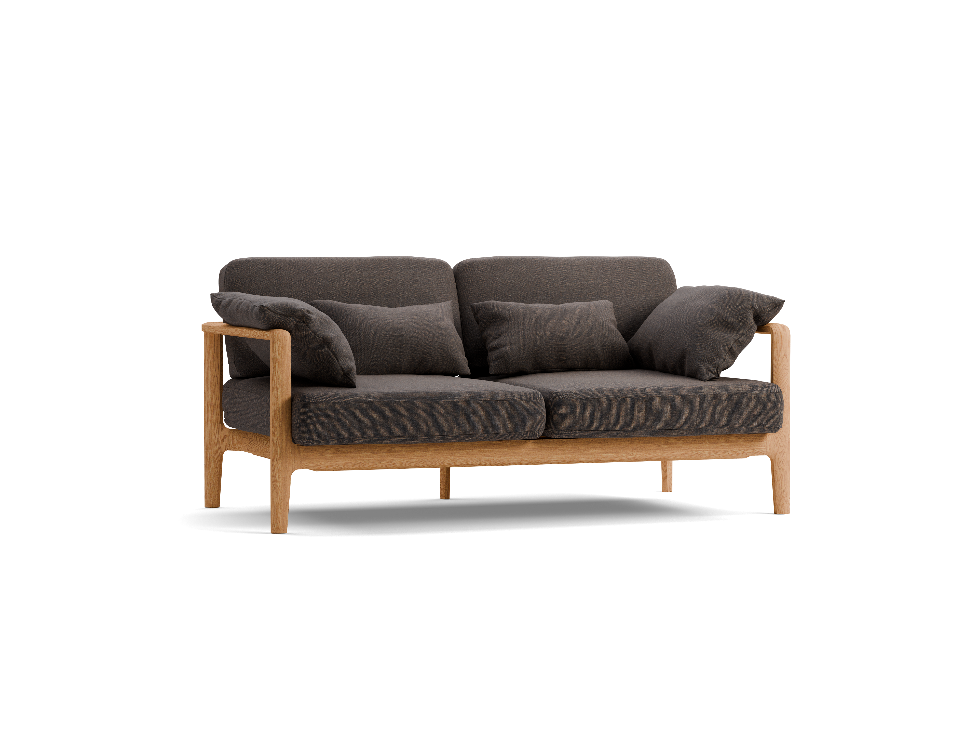 Der elegante, schlanke, feinsinnige Sofarahmen aus fix verleimtem Massivholz – mit sanften, verrundeten, fließenden Übergängen und Verbindungen – umfängt die Polsterelemente relingartig und gibt dem Sofa auch eine reizvolle Rückenansicht.-