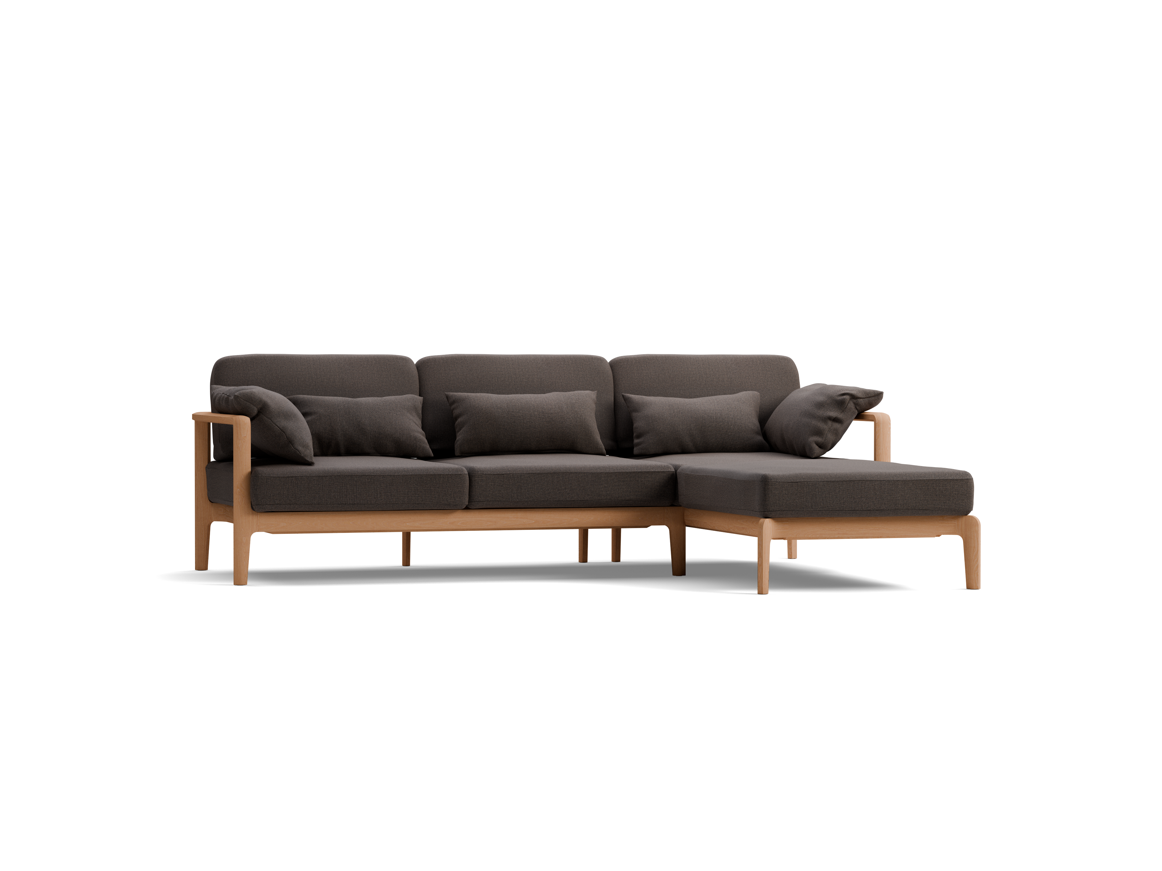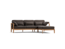 Der elegante, schlanke, feinsinnige Sofarahmen aus fix verleimtem Massivholz – mit sanften, verrundeten, fließenden Übergängen und Verbindungen – umfängt die Polsterelemente relingartig und gibt dem Sofa auch eine reizvolle Rückenansicht.-