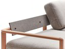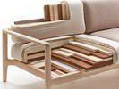 Der elegante, schlanke, feinsinnige Sofarahmen aus fix verleimtem Massivholz – mit sanften, verrundeten, fließenden Übergängen und Verbindungen – umfängt die Polsterelemente relingartig und gibt dem Sofa auch eine reizvolle Rückenansicht.-