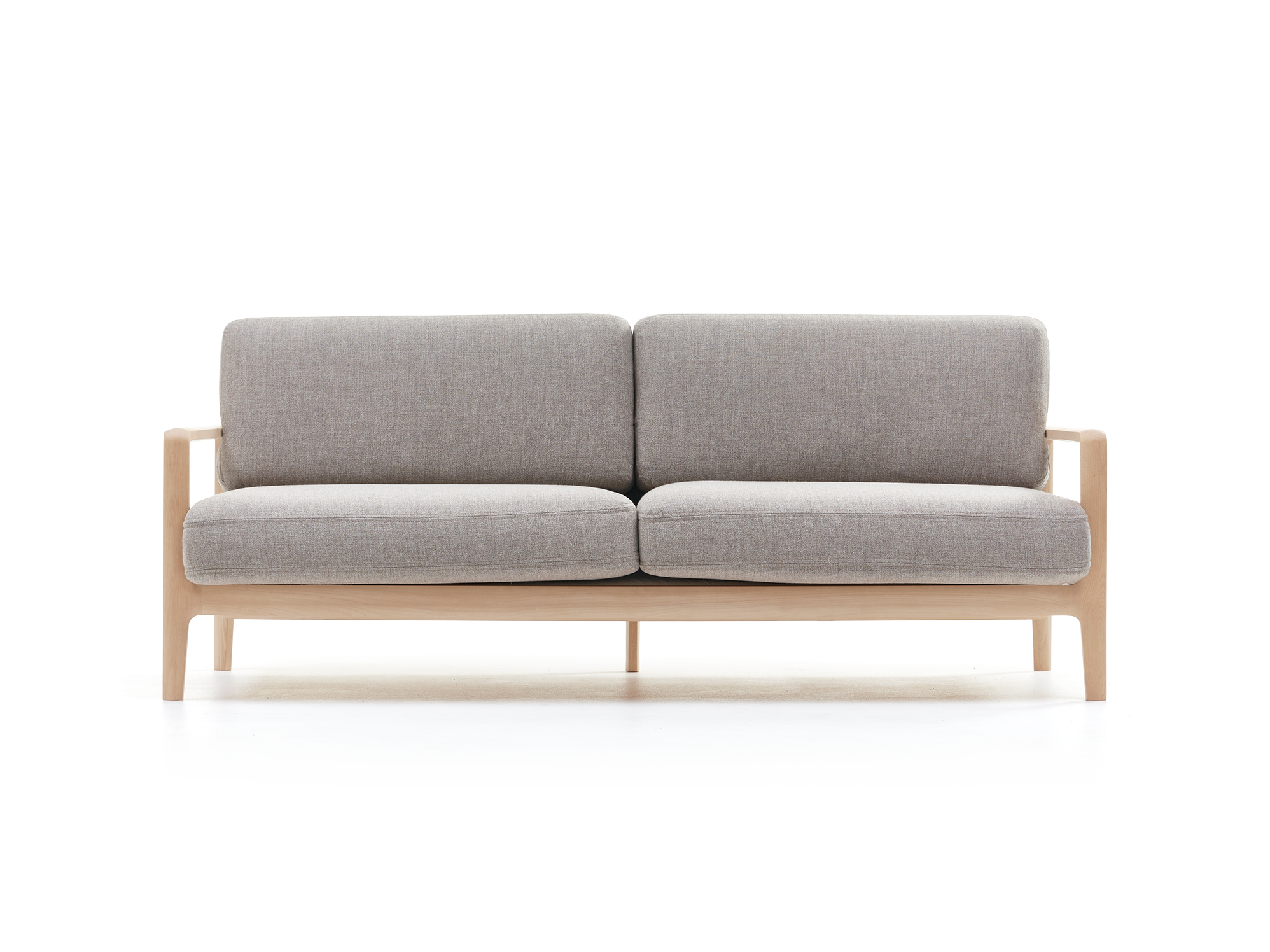 Der elegante, schlanke, feinsinnige Sofarahmen aus fix verleimtem Massivholz – mit sanften, verrundeten, fließenden Übergängen und Verbindungen – umfängt die Polsterelemente relingartig und gibt dem Sofa auch eine reizvolle Rückenansicht.-