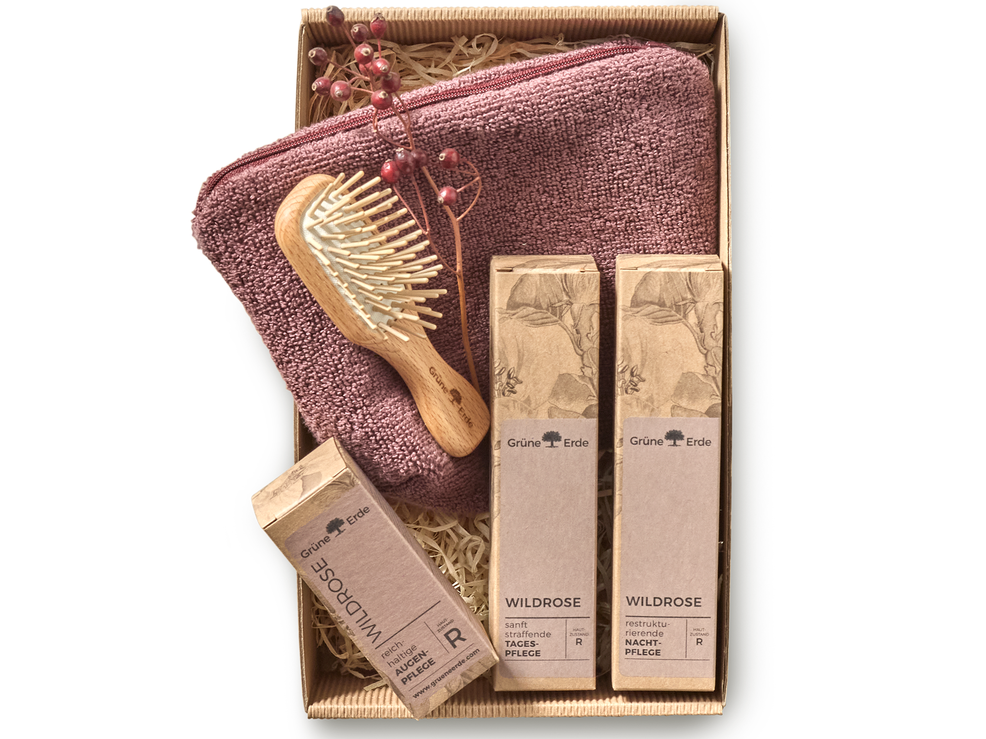 Geschenkbox „Wildrose“ – natürliche Schönheit mit der Kraft der RoseDie Geschenkbox „Wildrose“ vereint hochwertige Naturkosmetik mit stilvollen Accessoires. Sie ist ideal für alle, die sich eine verwöhnende Pflegeroutine mit sanften, aber wirksamen Produkten gönnen möchten. Ein liebevolles Geschenk für besondere Anlässe – oder um sich selbst etwas Gutes zu tun.Inhalt der Box:• WILDROSE sanft straffende Tagespflege – feuchtigkeitsspendende Pflege für ein ebenmäßiges Hautbild (40462)• WILDROSE restrukturierende Nachtpflege – regeneriert die Haut über Nacht und unterstützt ihre natürliche Balance (40463)• WILDROSE reichhaltige Augenpflege– pflegt die empfindliche Augenpartie intensiv (40484)• Haarbürste aus Buchenholz & Naturkautschuk – ökologisch, handlich und sanft zum Haar (47673)• Kosmetiktasche „ANEA mini“, pflaume aus biologischer Baumwolle – stilvoller Begleiter für unterwegs (414264)Die Wildrosen-Kosmetik ist reich an natürlichen Inhaltsstoffen aus kontrolliert biologischem Anbau und sorgt für eine sanfte, aber effektive Pflege von Gesicht und Augen. Mit praktischen Accessoires aus Naturmaterialien wie die Haarbürste und die Baumwolltasche vereint dieses Set hochwertige Pflege, Qualität und StilDas ideale Geschenk für:Alle, die Wert auf natürliche Schönheitspflege, hochwertige Materialien und liebevolle Details legen – ob zum Geburtstag, zu Weihnachten oder einfach als kleine Aufmerksamkeit. -