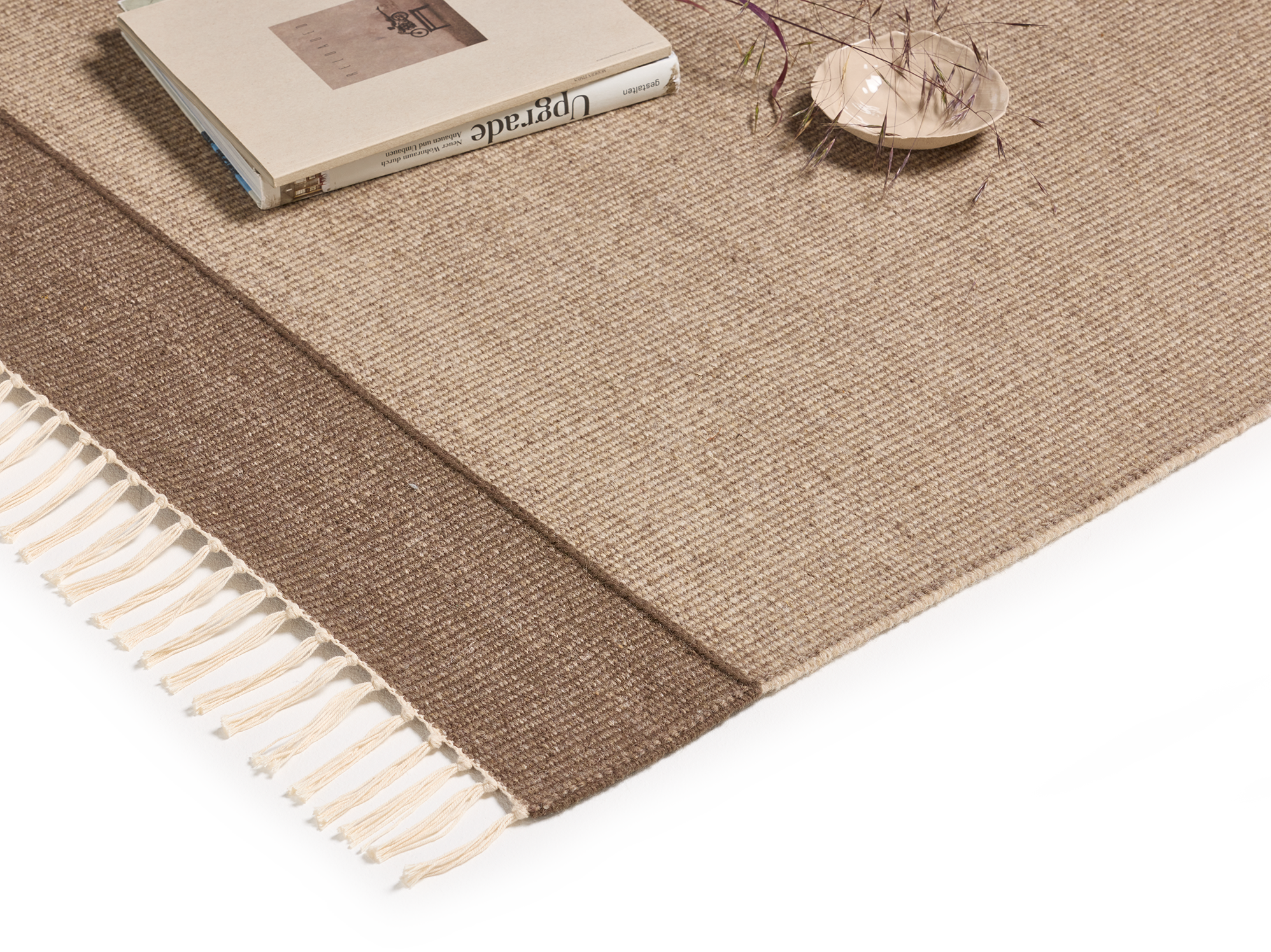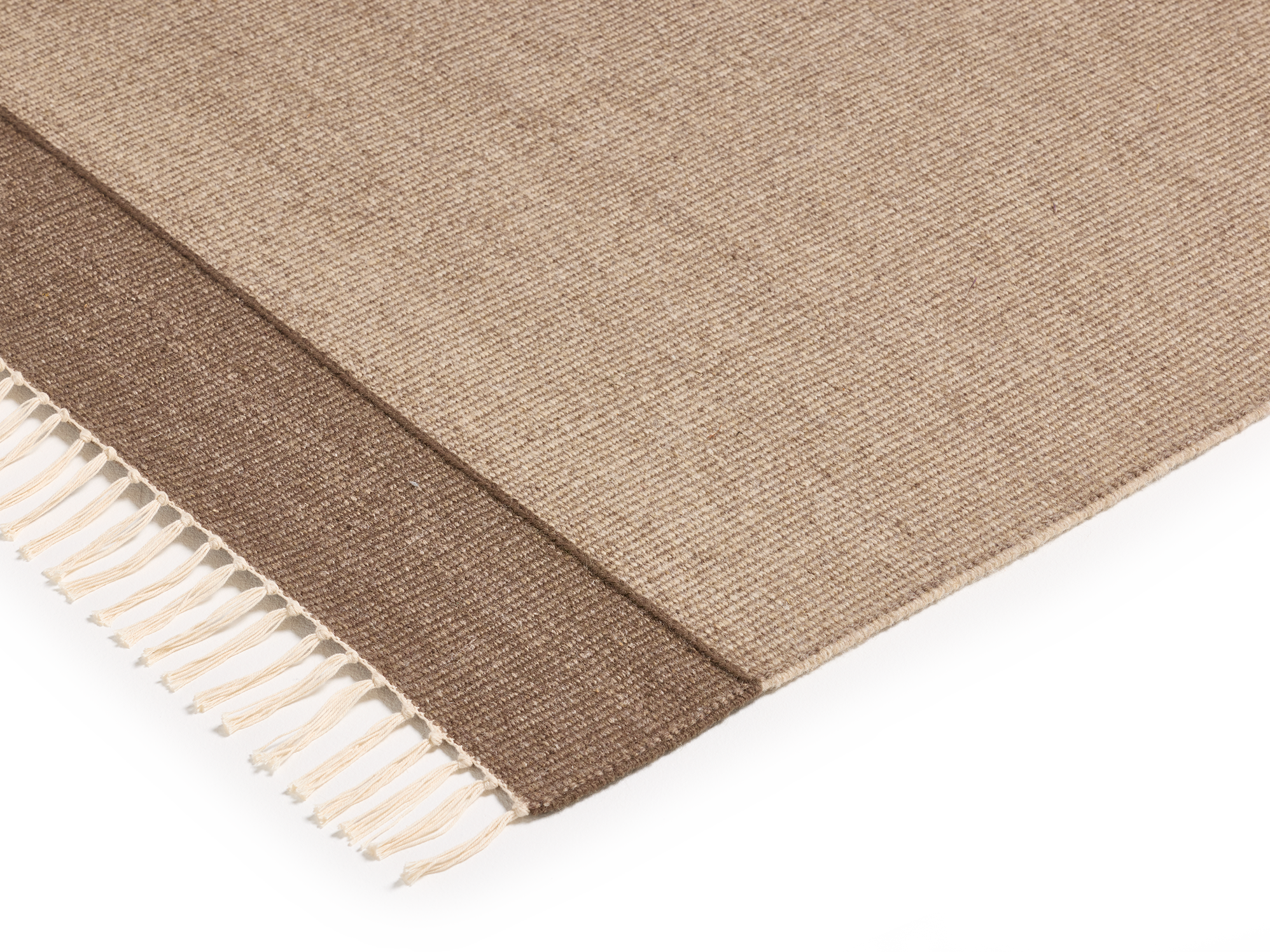 Schlicht-elegantes Design, wertvolles MaterialDieser handgewebte Teppich ist unsere zeitgemäße Interpretation des klassischen Kelim. Bei diesem aus Vorderasien stammenden Teppich-Typ werden die Schussfäden nicht bloß zwischen den Kettfäden hindurchgeführt, sondern auch um diese herumgewickelt – ein sehr aufwendiger handwerklicher Prozess: Es dauert acht Stunden, um einen 70 x 140 cm großen Teppich zu weben.Beim Kelim Trivia blieb die traditionelle Webtechnik erhalten, das Design jedoch wurde radikal erneuert. Statt kleinteiliger, folkloristischer Muster und knallbunten Farben, wie bei herkömmlichen Kelims üblich, dominiert bei diesem Teppich zeitgemäße Schlichtheit: großformatige, streng gegliederte Flächen, ruhige, gedeckte Farben in Sand- und Kiesel-Nuancen, Licht-Schatten-Effekte. Der breite, dunkle Rand begrenzt und betont die hellere Fläche. Beide Segmente sind getrennt durch einen "Sumak" genannten, handgeflochtenen Zopf aus den dunkelsten Schussfäden des Teppichs.In Bezug auf Farbe und Design sehr zurückhaltend, konzentriert sich der Teppich auf das nicht auf den ersten Blick sichtbare Wesentliche: das wertvolle Material und die sorgfältige Handarbeit. Aufgrund seiner Schlichtheit lässt sich Trivia gut mit anderen Objekten kombinieren.Der Kelim wird in Handarbeit auf 50 Jahre alten, hölzernen Webstühlen in unserem ungarischen Partnerbetrieb gefertigt. Die Schussfäden aus sehr flauschig gezwirnten Schurwollstreichgarnen werden beim Weben kräftig angeschlagen, sodass die Kettfäden aus Baumwolle im fertigen Teppich nicht mehr sichtbar sind. Der Webkörper ist sehr flach und extrem dicht. Jeweils 8 Kettfäden sind zu 8 cm langen Fransen geknotet.Gewicht: ca. 1,6 kg/m284 % Schurwolle (Schaf), 16 % Baumwolle. Handgewebt in Ungarn.Schurwolle (Schaf) kbT aus Deutschland, England. Baumwolle kbA aus der Türkei.Hinweis: Eine maximale Größenabweichung von +/- 3 % ist bedingt durch die Handarbeit möglich. Maße exkl. Fransen.Wir bieten eine Maßanfertigung in 5-cm-Schritten bis zu einer Breite von 300 cm, Mindestbreite 40 cm, an. Bitte setzen Sie sich dazu mit unserem Kundenservice in Verbindung. -