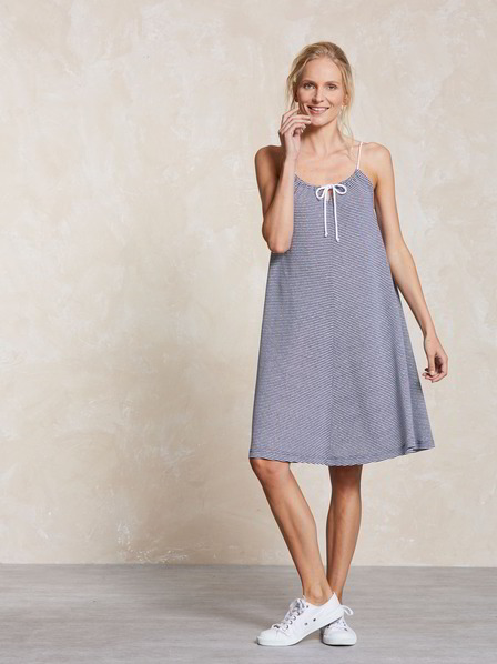 Dieses wunderbar angenehme Kleid aus hochwertigem Halbleinen entsteht dank der Kombination zweier Naturfasern: weicher Bio-Baumwolle und wertvollem Leinen. Das Kleid mit den Querstreifen punktet mit einer gemütlichen Schnittführung und dem eingearbeiteten Kordelzug am Halsausschnitt. Ideal für die warmen Sommertage!Schnitt: A-Linie/kniefrei. In Größe 36 ca. 125 cm lang.Verarbeitung: 51 % Baumwolle. 49 % Leinen. Baumwolle kbA aus der Indien. Leinen kbA aus Tunesien. Gewebt in Portugal. Fair gefertigt in Portugal nach dem GOTS. -