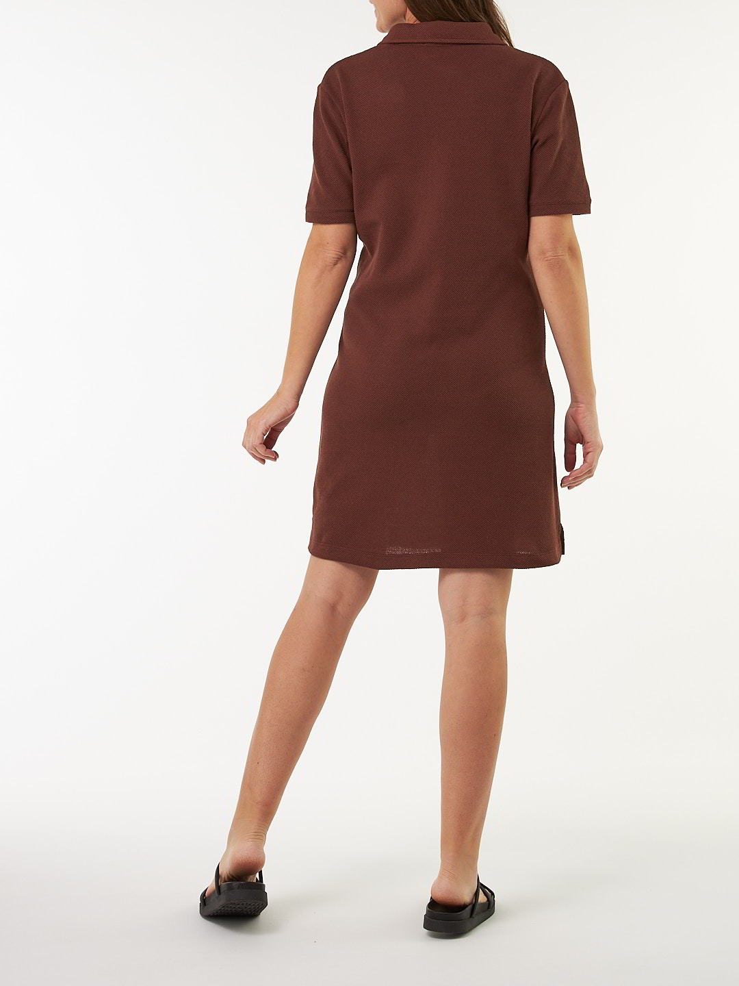 Das Polokleid mit zarter Waffelstruktur sorgt dank der weichen, atmungsaktiven Baumwoll-Qualität für ein angenehmes Tragegefühl – ideal für warme Tage und die Übergangszeit. Der leicht taillierte Schnitt mit Kragen und femininem V-Ausschnitt verleiht dem Kleid eine moderne, legere Silhouette. Der knieumspielende Verlauf und der seitliche Schlitz am Beinsaum unterstreichen die Leichtigkeit des Designs.