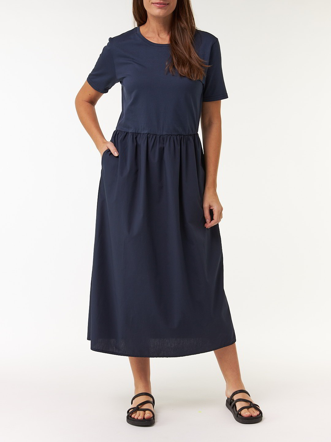Feminines Kleid mit Oberteil in weicher Jersey-Qualität und Rockteil aus sommerlicher Popeline. Der Rundhalsausschnitt und der figurbetonte Schnitt unterstreichen die klare, moderne Silhouette, während das Rockteil in 7/8-Länge mit seitlichen Eingriffstaschen eine sportive Note verleiht. Die Kombination aus elastischem Jersey und Popeline sorgt für einen modernen, ausgewogenen, lässig-eleganten Look.