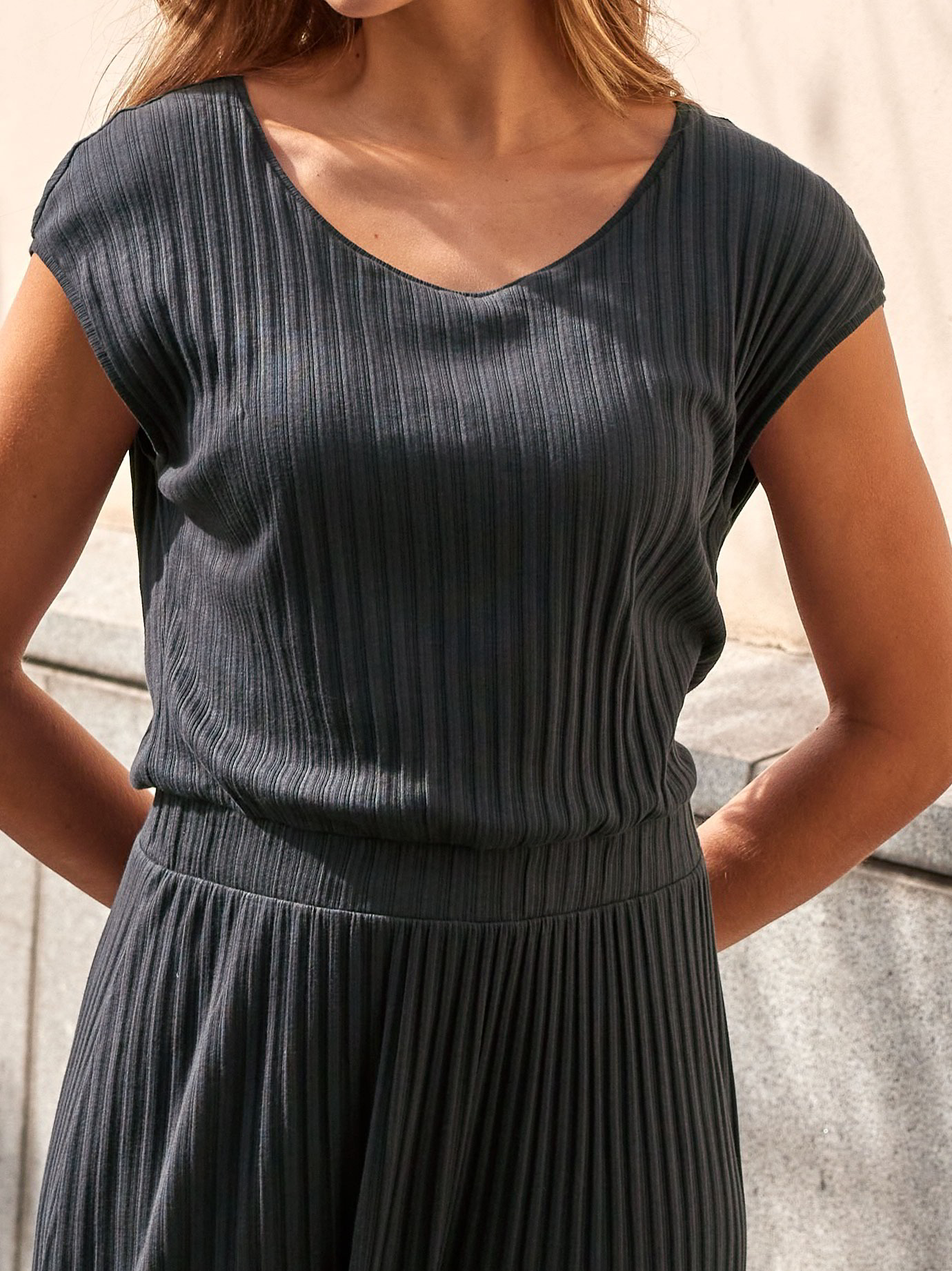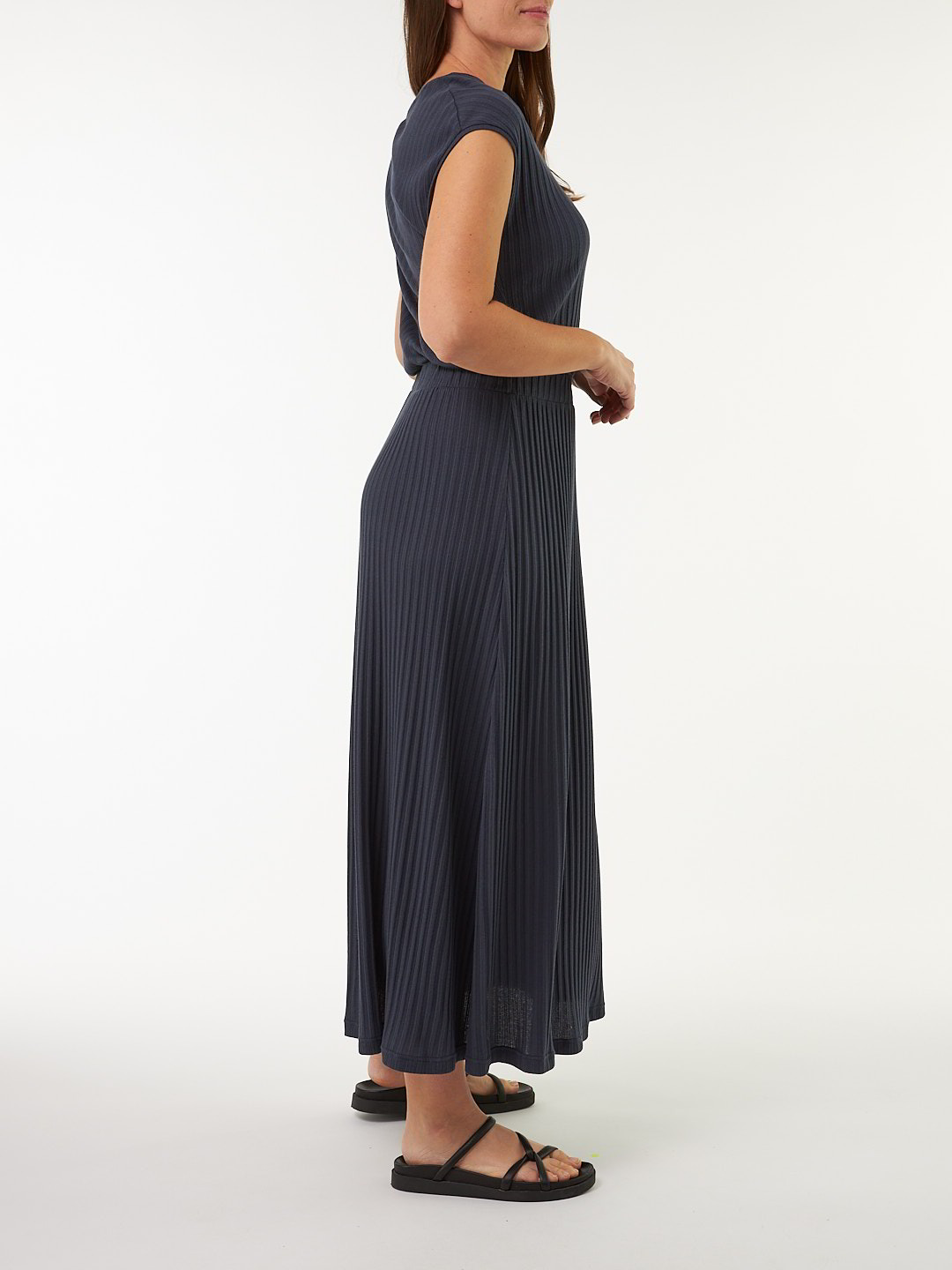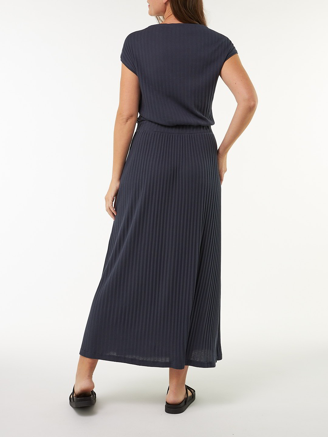 Fließendes Kleid aus hautfreundlicher Baumwolle kbA in markanter Breitripp-Struktur. Das Modell zeigt sich mit überschnittener Schulterpartie, Rundhalsausschnitt und einem breiten Gummibund in der Taille, der die weite Silhouette sanft formt. Der Rock fällt leicht ausgestellt bis zum Knöchel und unterstreicht den fließenden, modernen Look. Ein vielseitiges Kleid mit klarer Linienführung und natürlicher Materialqualität – pur, komfortabel und zeitlos schön.