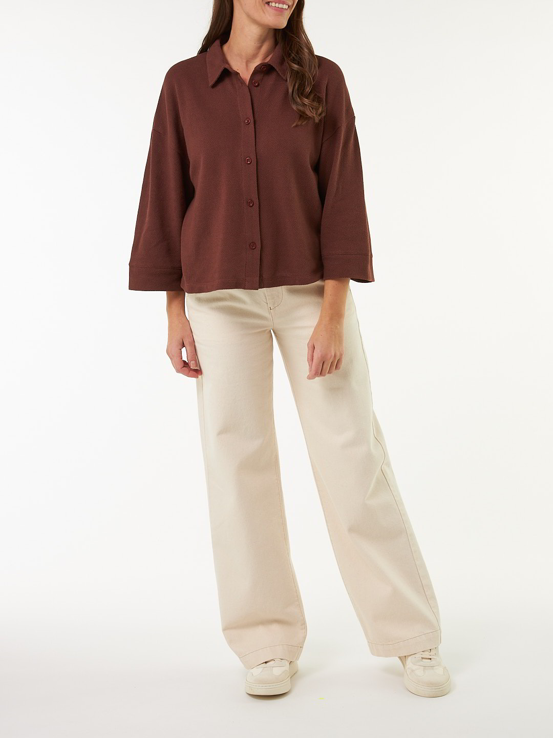 Die Hemdbluse mit zarter Waffelstruktur sorgt dank der weichen, atmungsaktiven Baumwoll-Qualität für ein angenehmes Tragegefühl – ideal für alle Jahreszeiten. Die lockere Schnittführung mit überschnittenen Schultern, Kragen und durchgehender Knopfleiste verleiht der Bluse eine moderne, entspannte Silhouette. Ob als Shirtjacke, offen getragen über einem Top oder geschlossen als Statement-Piece – dieses vielseitige Kleidungsstück passt sich jedem Stil an. Der kastige Schnitt unterstreicht den puren, natürlichen Charakter der Serie.