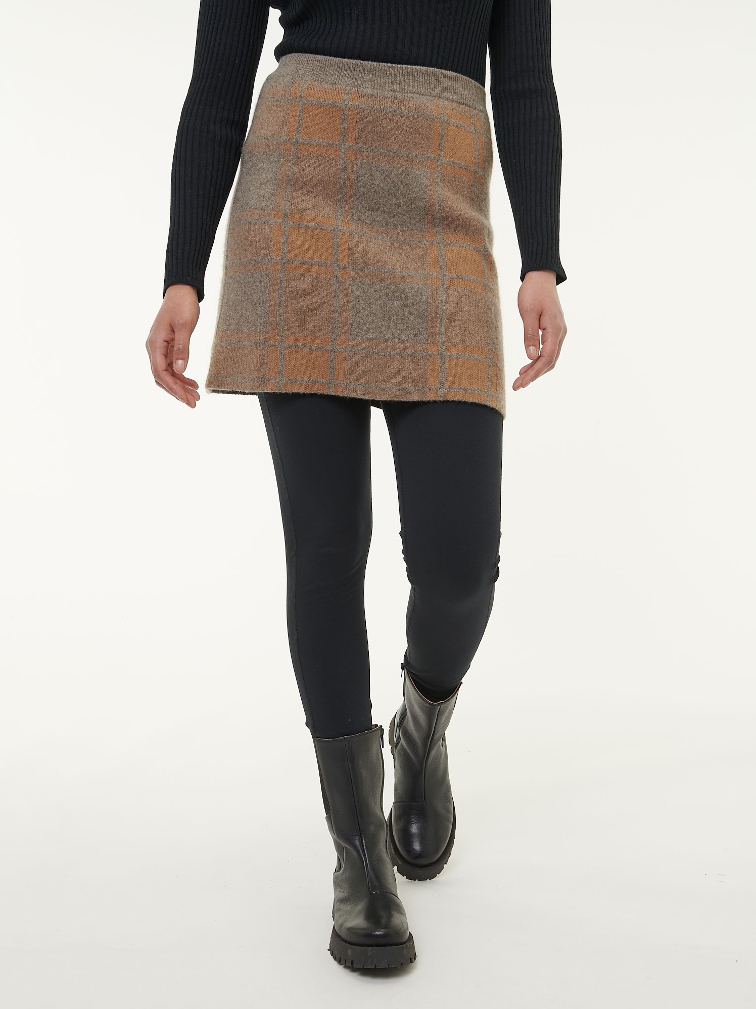 Ein Stück Natur – pur, zurückhaltend und langlebigDieser edle Strickrock vereint zwei der kostbarsten Naturfasern: ungefärbte Yakwolle und feines Kamelhaar. Die Kombination sorgt für ein besonders weiches, temperaturausgleichendes Tragegefühl mit natürlicher Eleganz. In klassischer Jacquard-Qualität gefertigt, zeigt sich das dezente Karo-Dessin als stilvolles Understatement – zeitlos, klar und unaufgeregt. Der legere Schnitt mit weichem Bund umspielt die Silhouette mühelos. Auch zum Wenden möglich.Schnitt: leger/mini. Länge in Größe S (36/38) ca. 46 cm. Unsere Models sind zwischen 175 cm und 177 cm groß und tragen Kleidergröße S.Ökologisch & fair produziertEin schönes Stück Natur, welches wir nur zu gern tragen. Dieses Kleidungsstück entsteht aus der Kombination von wertvoller Yakwolle sowie edlem Kamelhaar und wird in größter ökologischer Sorgfalt bei unserem Partnerbetrieb gefertigt. Die gesamte Wertschöpfung bleibt im Land der Rohfaser – fair gegenüber Mensch, Tier und Natur. Um die Langlebigkeit des Naturproduktes zu erhalten, empfehlen wir einen sorgsamen und wertschätzenden Umgang im alltäglichen Gebrauch.Material: 53 % Yakwolle, 47 % Kamelhaar.Materialherkunft: Yakwolle aus der Mongolei. Kamelhaar aus der Mongolei. Gestrickt in der Mongolei. Gefertigt in der Mongolei. -