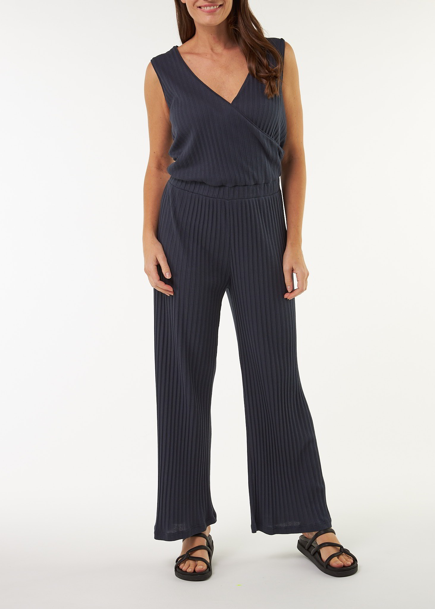 Fließender Overall aus hautfreundlicher Baumwolle kbA in markanter Breitripp-Struktur. Das ärmellose Modell zeigt sich mit femininer Wickeloptik im Oberteil und einem breiten Gummibund in der Taille, der die Silhouette sanft betont. Das lange, weit geschnittene Bein unterstreicht den modernen, eleganten Fall. Ein vielseitiger Look mit natürlicher Struktur – pur, bequem und zeitlos schön.