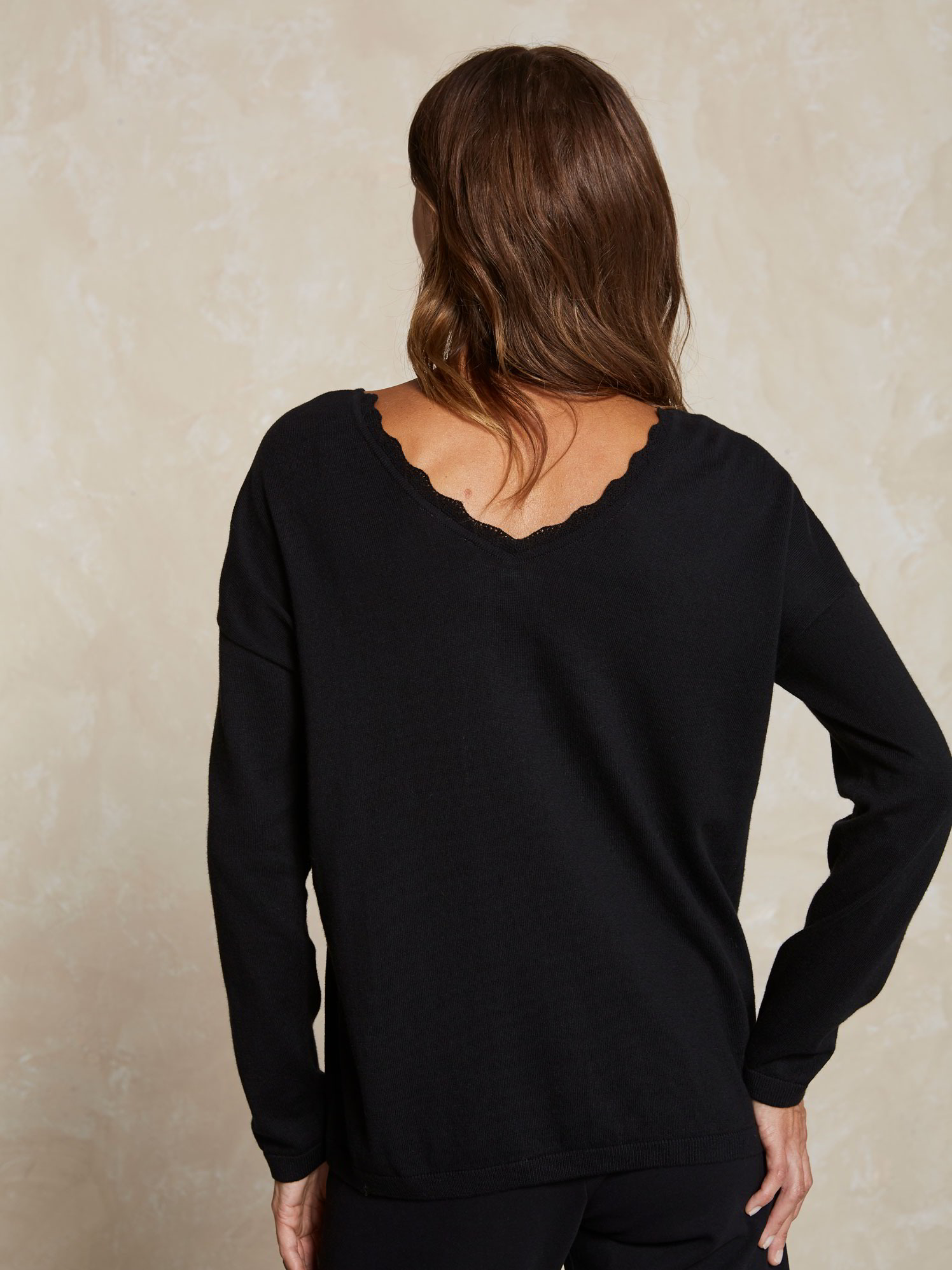 Der Pullover war leider zu weit ausgeschnitten, im Ganzen hatte er einen Eindruck von etwas "schlabberig"