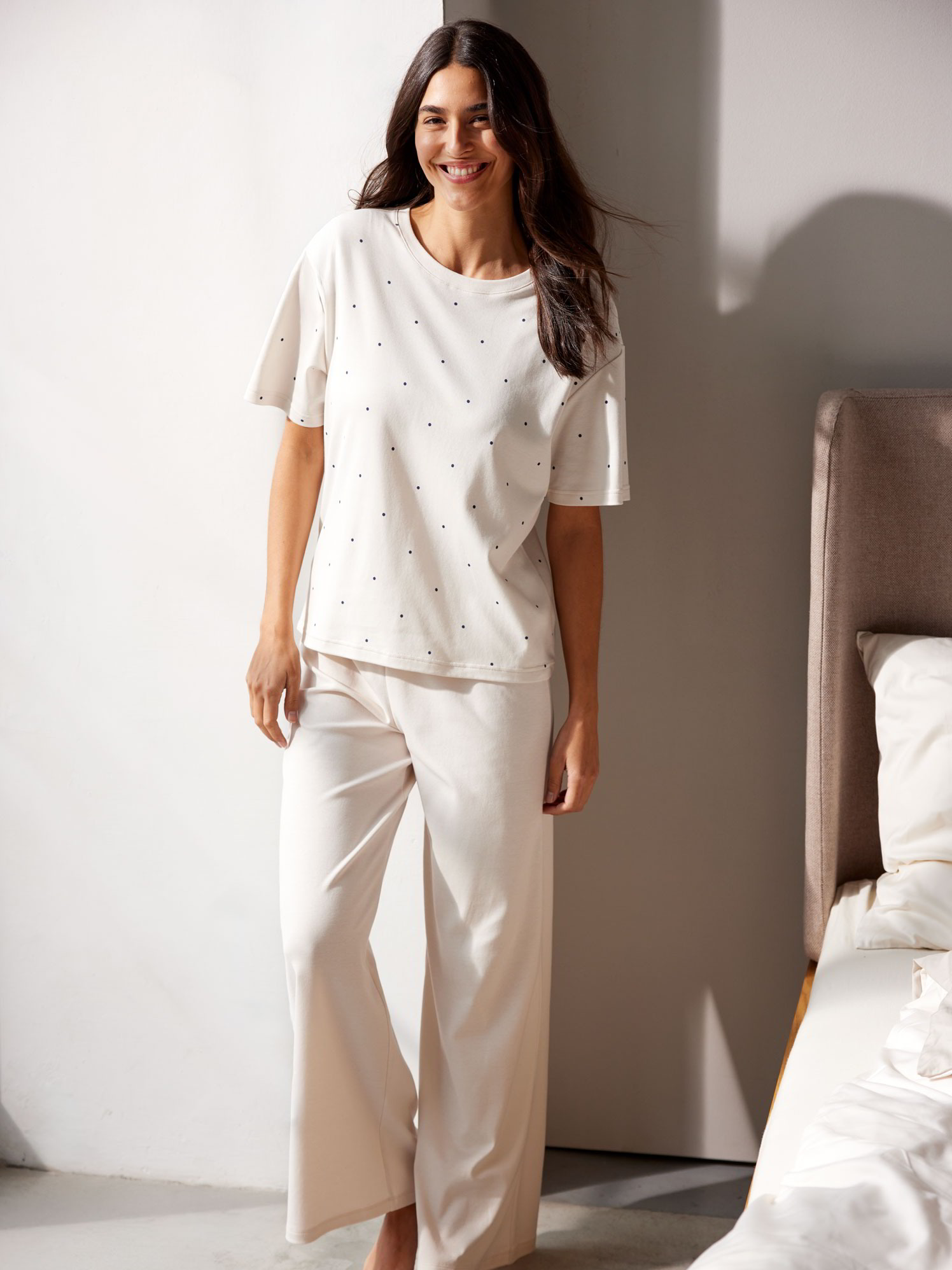 Lange Schlafhose aus reiner Baumwolle in hochwertiger Interlock-Qualität – besonders weich, anschmiegsam und angenehm auf der Haut. Der schmale Gummibund sorgt für bequemen Sitz, während das puristische Design ganz ohne zusätzliche Details auskommt. Ein zeitloses Basic, welches durch seine klare Linie und den hohen Tragekomfort überzeugt – perfekt kombinierbar mit dem passenden Schlafshirt.