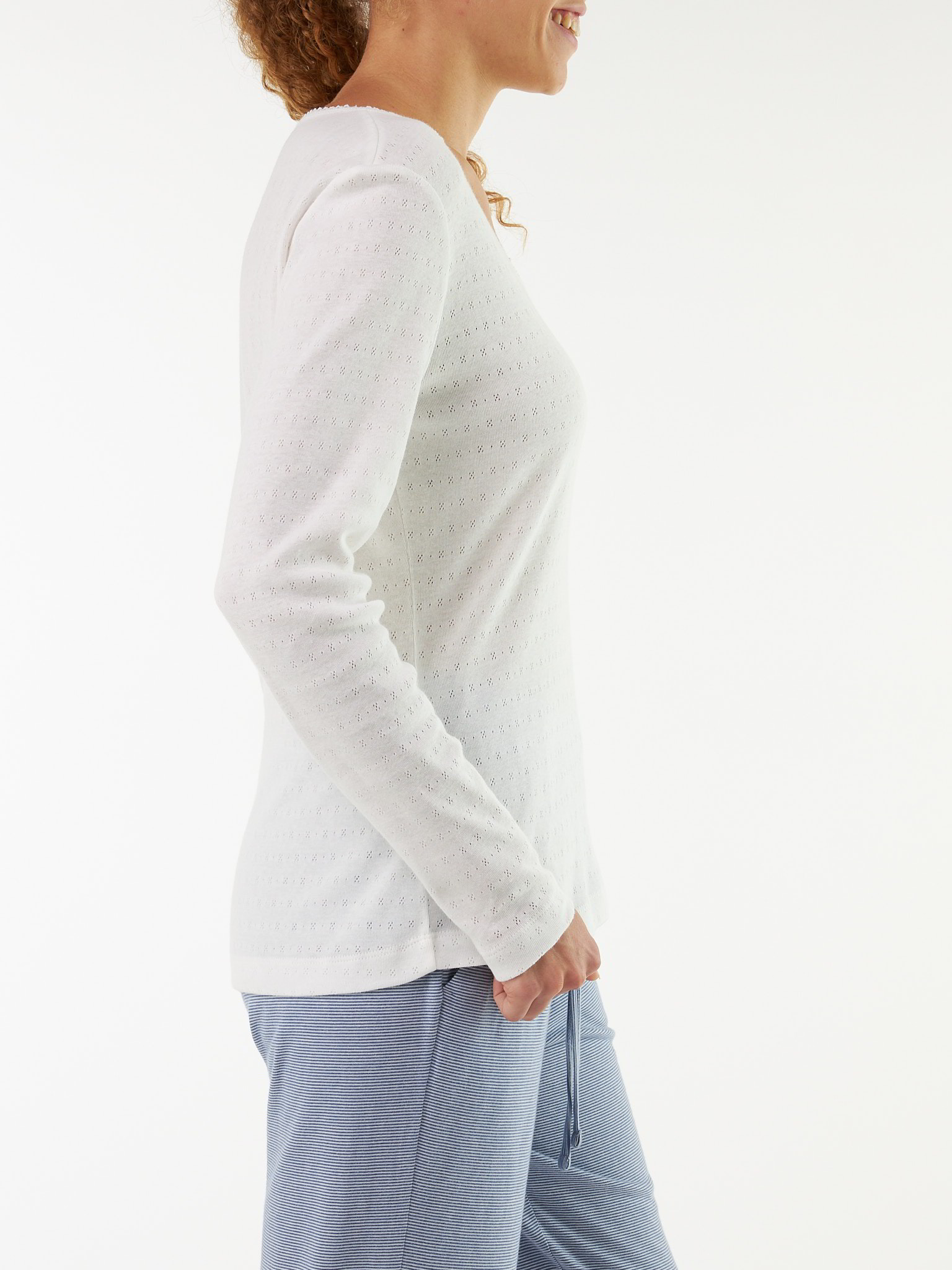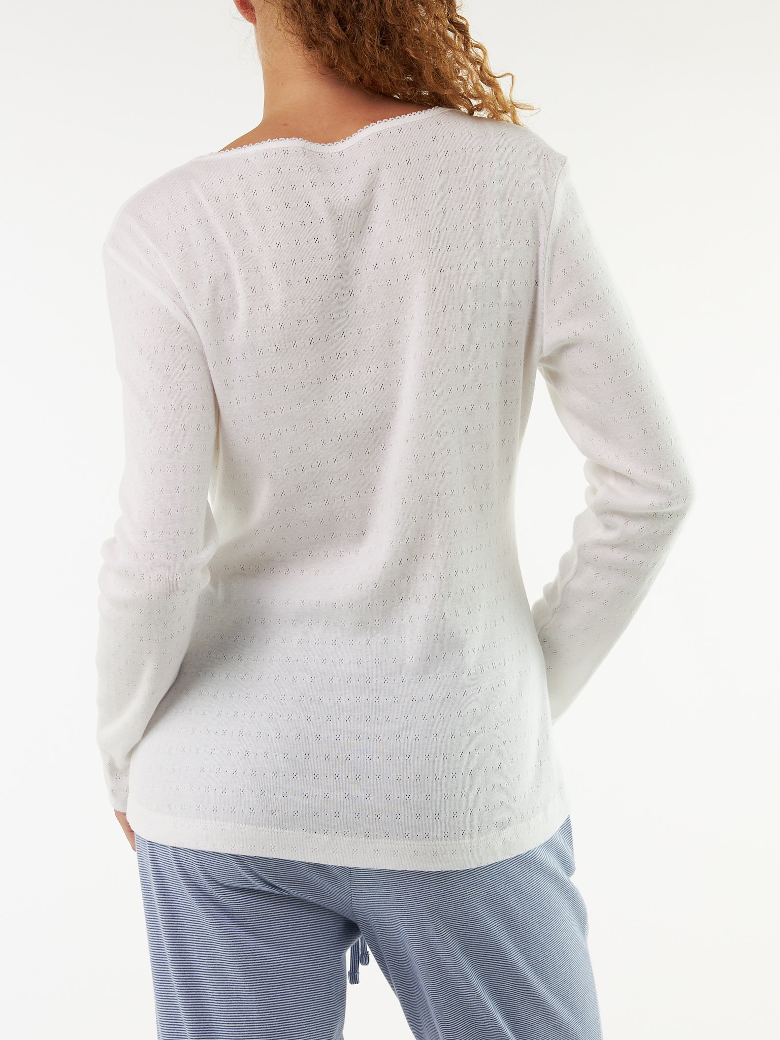 Für ein zartes Gefühl und eine feminine SilhouetteGarantiert ein Lieblingsstück: klassisches Langarm-Shirt aus hochwertiger, weicher Baumwolle. Das Modell mit der feinen Ajour-Dessinierung überzeugt mit seiner zarten Optik, dem weichen Griff und der hochwertigen Fertigung – garantiert ökologisch & sozial fair! Abgerundet wird das figurumspielende Shirt mit zarter Crochet-Kante entlang des Halsausschnitts.Schnitt: figurumspielend. In Größe S (36/38) ca. 64 cm lang. Unsere Models sind zwischen 175 cm und 177 cm groß und tragen Kleidergröße 36.Ökologisch & fair produziertEin schönes Stück Natur, welches wir nur zu gern tragen. Dieses Kleidungsstück entsteht aus Baumwolle kbA und wird nach strengen Richtlinien – wie dem Global Organic Textile Standard – bei unserem Partnerbetrieb gefertigt.Material: 100 % Baumwolle.Materialherkunft: Baumwolle kbA aus Griechenland. Gewirkt in Griechenland. Gefertigt in Bulgarien nach dem GOTS. -
