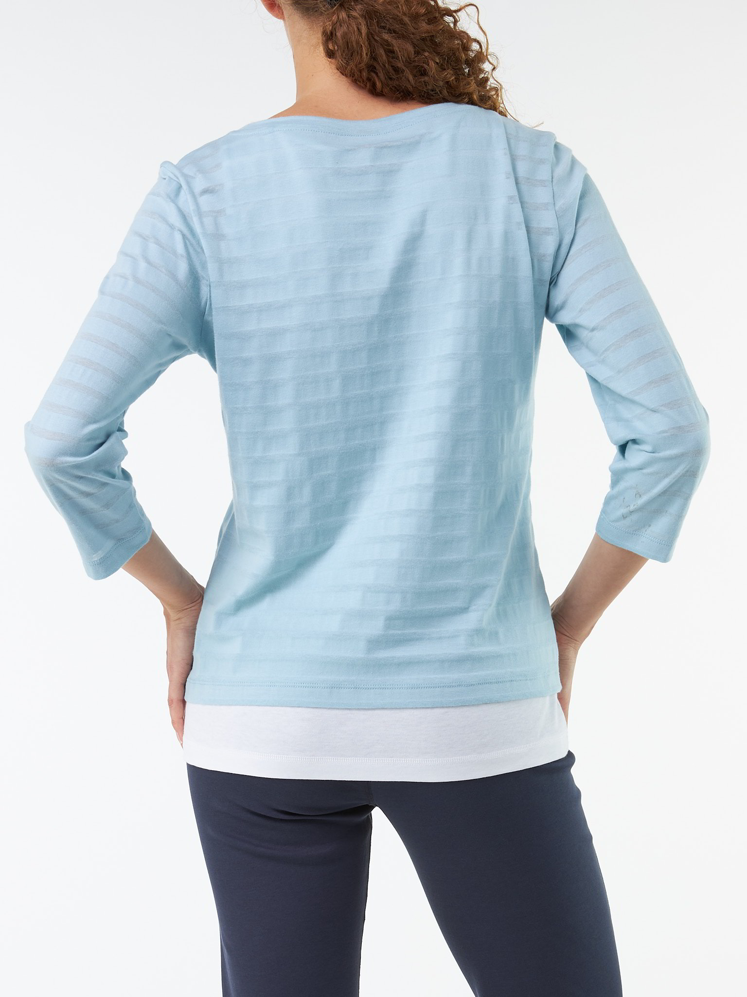 Feminine Transparenz zum KombinierenEin Highlight für warme Tage: 3/4-Arm-Shirt mit zart-transparentem Ausbrenner-Effekt. Das Modell aus weichem Baumwoll-Jersey fällt locker und angenehm auf der Haut. Der gerade Schnitt mit zartem U-Boot-Ausschnitt sorgt für eine feminine Silhouette.Schnitt: leger. In Größe S (36/38) ca. 57,5 cm lang. Unsere Models sind zwischen 175 cm und 177 cm groß und tragen Kleidergröße 36.Ökologisch & fair produziertEin schönes Stück Natur, welches wir nur zu gern tragen. Dieses Kleidungsstück entsteht aus Baumwolle kbA und wird nach strengen Richtlinien – wie dem Global Organic Textile Standard – bei unserem Partnerbetrieb gefertigt.Material: 100 % Baumwolle.Materialherkunft: Baumwolle kbA aus der Türkei. Gewirkt in Portugal. Gefertigt in Portugal nach dem GOTS. -