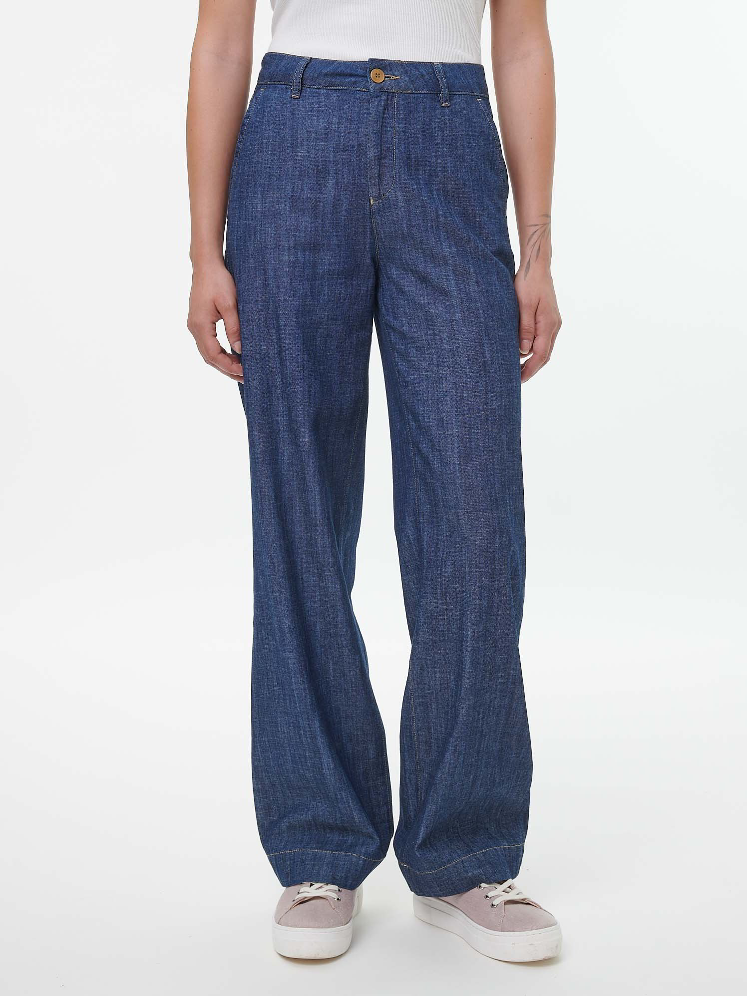 Unkomplizierte Hose aus hochwertigem Light Denim: Das Modell mit dem weiten Bein hat zwei seitliche Eingriffstaschen auf der Vorderhose, typische Sattelverarbeitung und aufgesetzte Gesäßtaschen auf der Hinterhose. Der Bund ist mit einem Reißverschluss und Knopf sowie Gürtelschlaufen versehen.