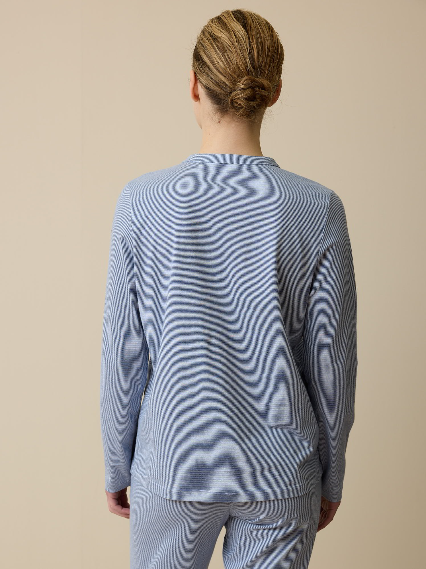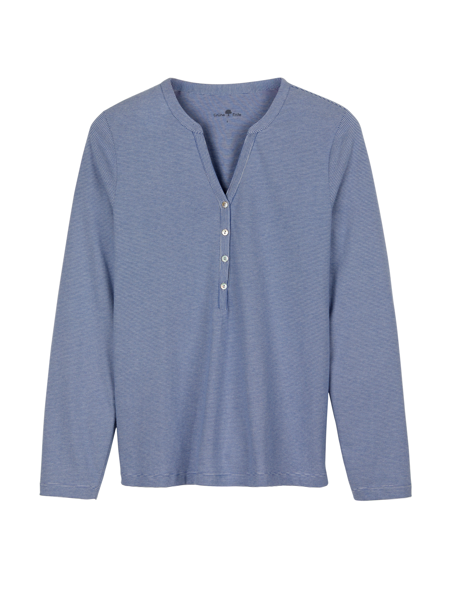Geborgenheit im SchlafEin natürliches Basic für die Nacht: Das figurumspielende Schlafshirt aus weichem Baumwoll-Jersey überzeugt mit einer feinen Ringel-Dessinierung. Das hochwertige Naturmaterial und der unkomplizierte Schnitt – mit Rundhalsausschnitt und langen Ärmeln – bieten einen leichten Tragekomfort.Schnitt: figurumspielend. In Größe S (36/38) ca. 64,5 cm lang. Unsere Models sind zwischen 175 cm und 177 cm groß und tragen Kleidergröße S.Ökologisch & fair produziertEin schönes Stück Natur, welches wir nur zu gern tragen. Dieses Kleidungsstück entsteht aus Baumwolle kbA und wird nach strengen Richtlinien – wie dem Global Organic Textile Standard – bei unserem Partnerbetrieb gefertigt.Material: 100 % Baumwolle.Materialherkunft: Baumwolle kbA aus der Türkei. Gewirkt in der Türkei. Gefertigt in der Türkei nach dem GOTS. -