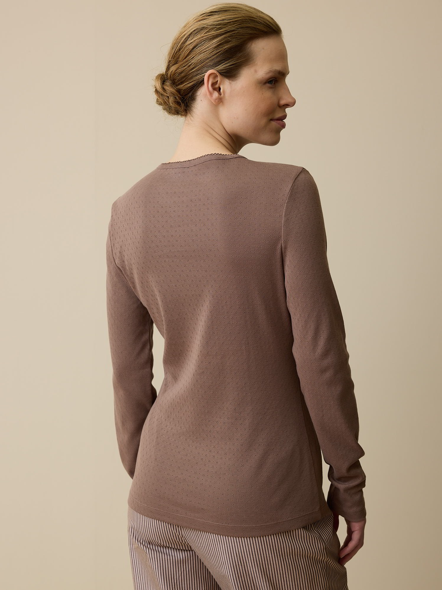 Spürbar weich, hochwertig und sanft zur HautZarte Farben kombiniert mit weicher Haptik: feminines Langarm-Shirt aus hautfreundlicher Baumwolle kbA. Das locker geschnittene Modell in feiner Ajour-Jersey-Qualität ist besonders weich zur Haut und spendet höchsten Tragekomfort. Zarte Details – wie eine feine Spitzenborte am abgerundeten V-Ausschnitt – vervollständigen das Shirt mit langen Ärmeln.Schnitt: figurumspielend. In Größe S (36/38) ca. 64 cm lang. Unsere Models sind zwischen 175 cm und 177 cm groß und tragen Kleidergröße S.Ökologisch & fair produziertEin schönes Stück Natur, welches wir nur zu gern tragen. Dieses Kleidungsstück entsteht aus Baumwolle kbA und wird nach strengen Richtlinien – wie dem Global Organic Textile Standard – bei unserem Partnerbetrieb gefertigt.Material: 100 % Baumwolle.Materialherkunft: Baumwolle kbA aus der Türkei. Gewirkt in der Türkei. Gefertigt in der Türkei nach dem GOTS. -
