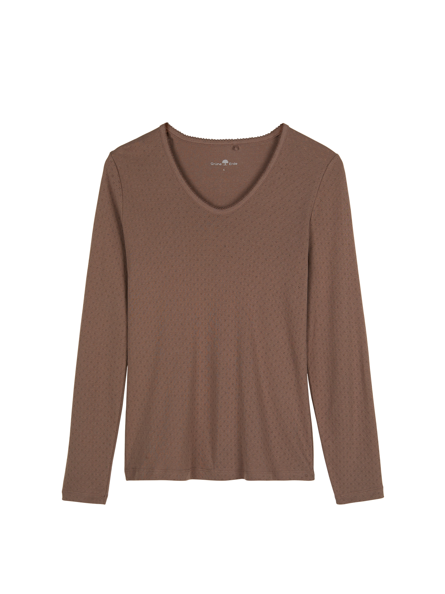 Spürbar weich, hochwertig und sanft zur HautZarte Farben kombiniert mit weicher Haptik: feminines Langarm-Shirt aus hautfreundlicher Baumwolle kbA. Das locker geschnittene Modell in feiner Ajour-Jersey-Qualität ist besonders weich zur Haut und spendet höchsten Tragekomfort. Zarte Details – wie eine feine Spitzenborte am abgerundeten V-Ausschnitt – vervollständigen das Shirt mit langen Ärmeln.Schnitt: figurumspielend. In Größe S (36/38) ca. 64 cm lang. Unsere Models sind zwischen 175 cm und 177 cm groß und tragen Kleidergröße S.Ökologisch & fair produziertEin schönes Stück Natur, welches wir nur zu gern tragen. Dieses Kleidungsstück entsteht aus Baumwolle kbA und wird nach strengen Richtlinien – wie dem Global Organic Textile Standard – bei unserem Partnerbetrieb gefertigt.Material: 100 % Baumwolle.Materialherkunft: Baumwolle kbA aus der Türkei. Gewirkt in der Türkei. Gefertigt in der Türkei nach dem GOTS. -