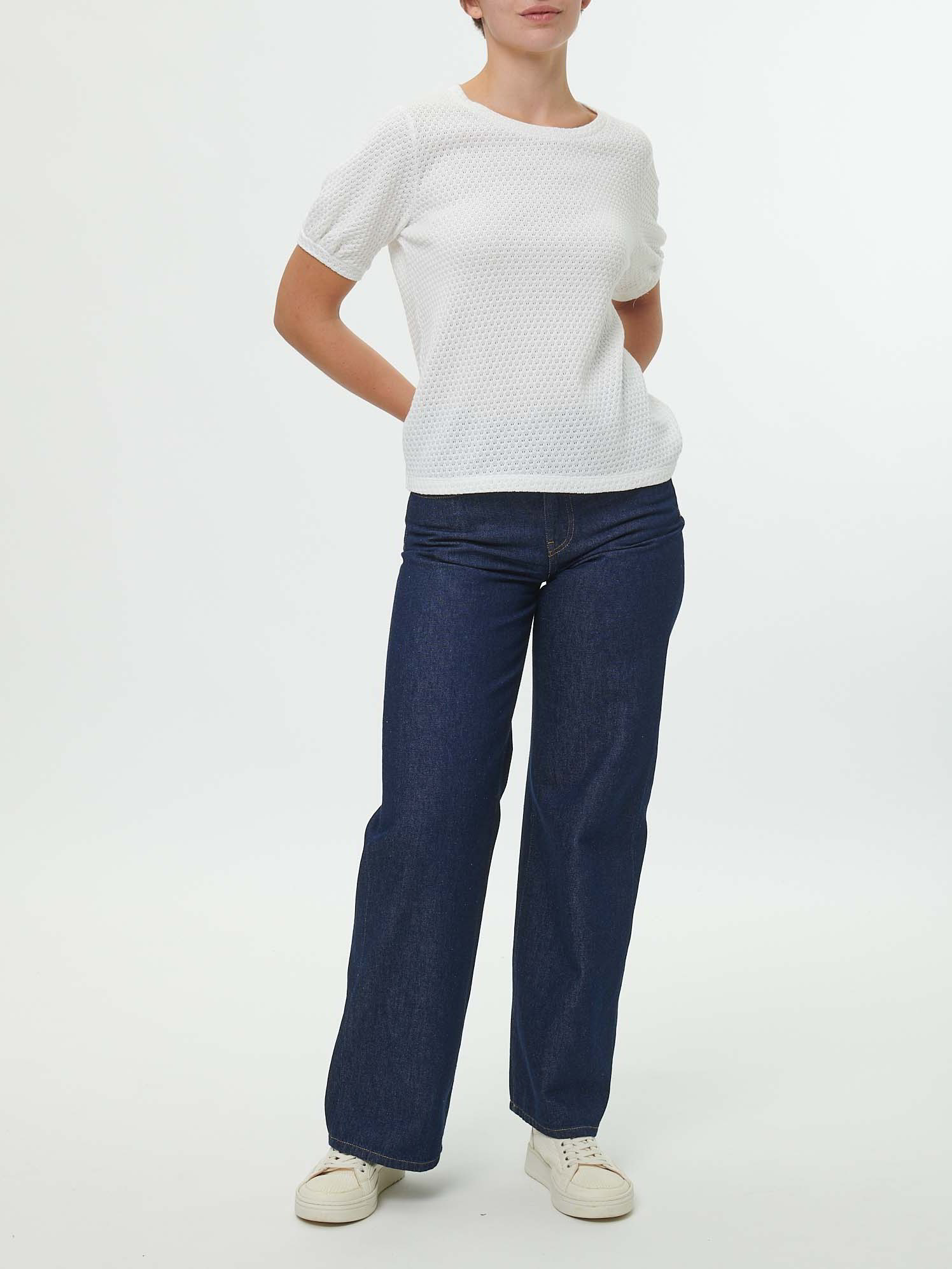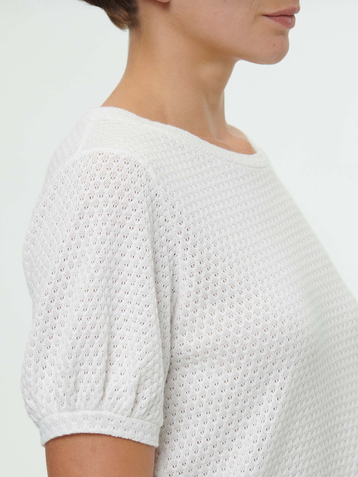 Leichtes Kurzarm-Shirt in feiner Ajour-Qualität – locker, vielseitig kombinierbar, zeitlos. Der Rundhalsausschnitt und die leichte Raffung am Ärmelsaum verleihen dem Modell eine feminine Note, das verkürzte Oberteil eine lässige Silhouette.