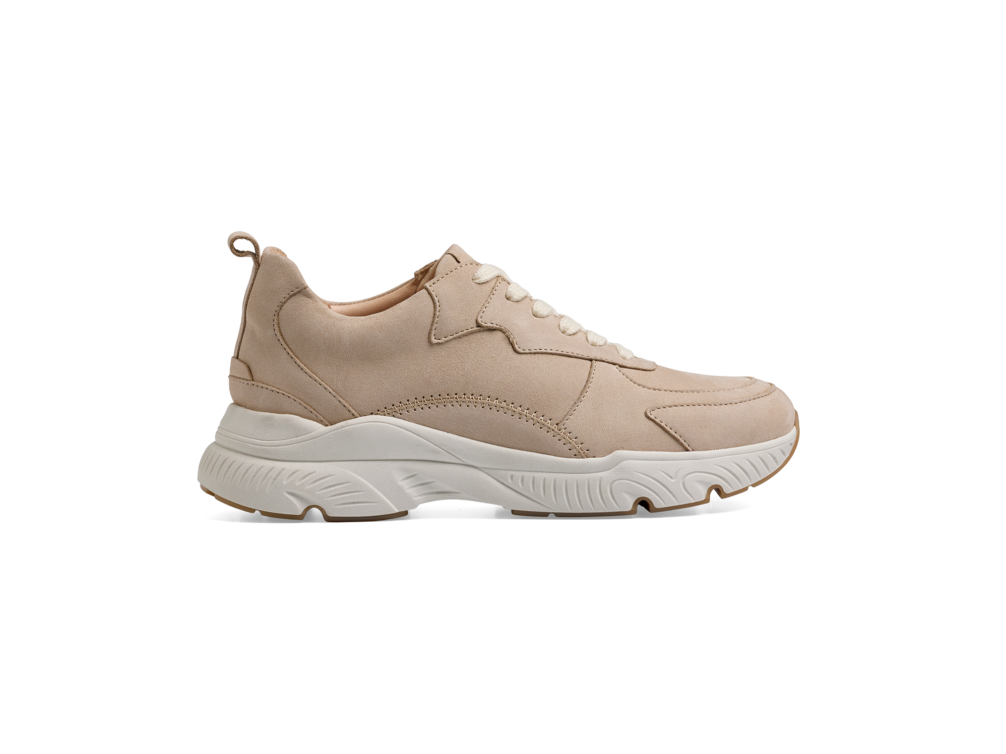 Sportiver Sneaker mit femininer Silhouette: Die etwas schmälere Form verleiht dem Schuh einen eleganten, gleichzeitig legeren Look. Gefertigt aus einer hochwertigen Kombination von Nubuk- und Nappaleder in natürlichem Sandton, fühlt sich der Sneaker angenehm weich an und passt zu zahlreichen Outfits. Die Schnürsenkel sorgen für sicheren Halt, während die TR-Sohle mit leichtem Plateau einen modernen Akzent setzt und für komfortables Gehen sorgt.