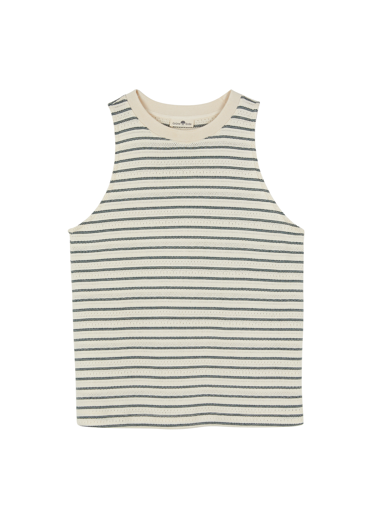 Feminin & zartÄrmelloses Top aus hochwertigem Ajour-Jersey – weich, angenehm auf der Haut und luftdurchlässig. Das Detail an der Halsleiste setzt einen eleganten Akzent, während die zarte Ringel-Dessinierung subtile Strukturen verleiht. Der locker fallende Schnitt sorgt für ein entspanntes, modernes Tragegefühl.Schnitt: leichte A-Linie. In Größe S (36/38) ca. 61 cm lang. Unsere Models sind zwischen 175 cm und 177 cm groß und tragen Kleidergröße S.Ökologisch & fair produziertEin schönes Stück Natur, welches wir nur zu gern tragen. Dieses Kleidungsstück entsteht aus weicher Baumwolle kbA und wird nach strengen Richtlinien – wie dem Global Organic Textile Standard – bei unserem Partnerbetrieb gefertigt.Material: 100 % Baumwolle.Materialherkunft: Baumwolle kbA aus der Türkei. Gewirkt in Portugal. Gefertigt in Portugal nach dem GOTS. -
