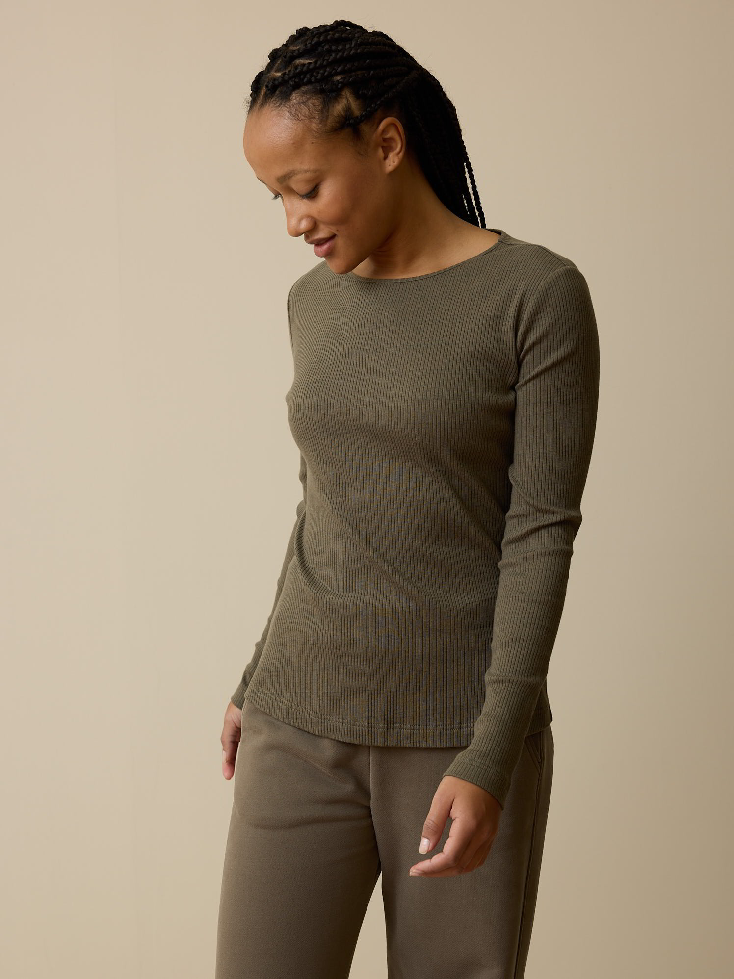 Zeitloses Langarm-Shirt mit feiner Ripp-Struktur, abgerundet mit Rundhalsausschnitt und langen Ärmeln. Die hautfreundliche Kombination aus weicher Baumwolle und temperaturausgleichender Wolle ist die perfekte Mischung für die ersten kalten Tage. Figurumspielend geschnitten, vielseitig kombinierbar – für zuhause oder unterwegs.