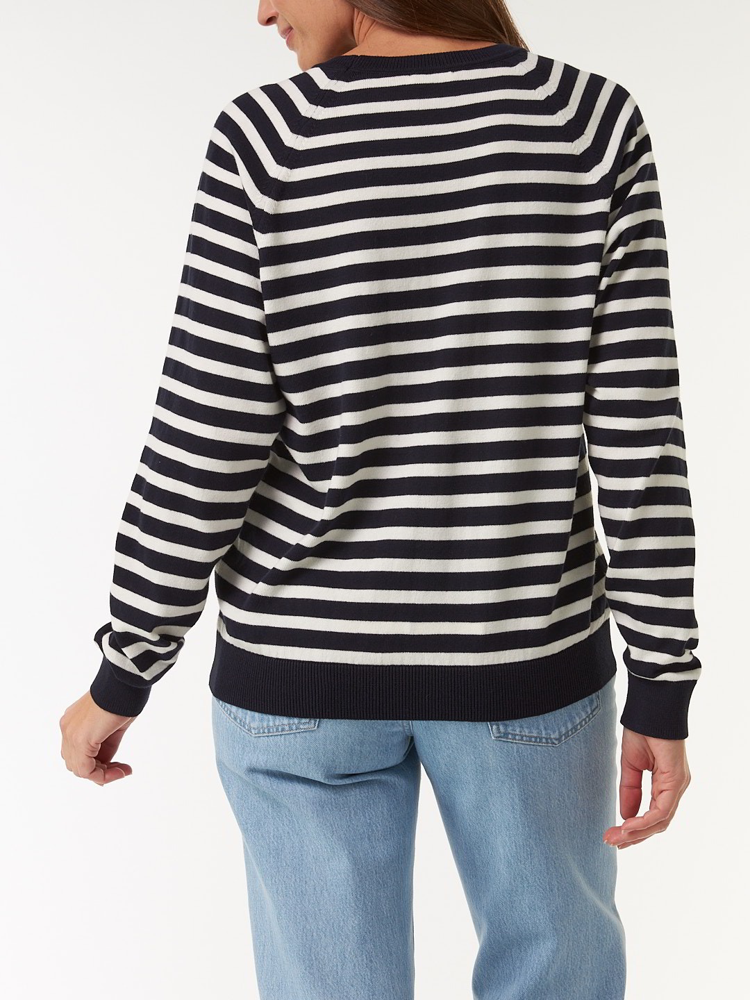 Weicher Strick, moderne StreifenDer Strickpullover mit langen Raglanärmeln überzeugt durch hochwertige Pima-Baumwolle – sanft zur Haut, anschmiegsam und weich. Ein halsnaher Rundhalsausschnitt und kontrastfarbene Rippbündchen an den Abschlüssen prägen die komfortable, lässige Silhouette.Schnitt: leger. In Größe S (36/38) ca. 58 cm lang. Unsere Models sind zwischen 175 cm und 177 cm groß und tragen Kleidergröße S.Ökologisch & fair produziertEin schönes Stück Natur, welches wir nur zu gern tragen. Dieses Kleidungsstück entsteht aus Baumwolle kbA und wird nach strengen Richtlinien – wie dem Global Organic Textile Standard – bei unserem Partnerbetrieb gefertigt.Material: 100 % Baumwolle.Materialherkunft: Baumwolle kbA aus der Türkei. Gestrickt in Portugal. Gefertigt in Portugal nach dem GOTS. -