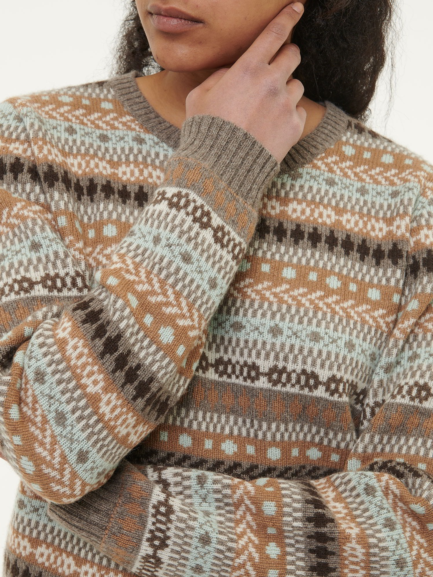 Nordische Geborgenheit aus 100 % NaturEdle Yakwolle, wertvolles Kamelhaar und wärmende Schurwolle werden kombiniert und es entsteht ein anschmiegsam-weicher Begleiter für die kühlere Jahreszeit. Das nordisch inspirierte Dessin wird mit ungefärbten Naturgarnen perfektioniert, der klassische Schnitt mit den breiten Ripp-Details an den Abschlüssen lockert die Silhouette auf.Schnitt: leger. In Größe S (36/38) ca. 58 cm lang. Unsere Models sind zwischen 175 cm und 177 cm groß und tragen Kleidergröße S.Ökologisch & fair produziertEin schönes Stück Natur, welches wir nur zu gern tragen. Dieses Kleidungsstück entsteht aus der Kombination von Yakwolle, Schurwolle sowie Kamelhaar und wird in größter ökologischer Sorgfalt bei unserem Partnerbetrieb gefertigt. Die gesamte Wertschöpfung bleibt im Land der Rohfaser – fair gegenüber Mensch, Tier und Natur. Um die Langlebigkeit des Naturproduktes zu erhalten, empfehlen wir einen sorgsamen und wertschätzenden Umgang im alltäglichen Gebrauch.Material: 52 % Yakwolle, 31 % Schurwolle, 17 % KamelhaarMaterialherkunft: Yakwolle aus der Mongolei. Schurwolle aus der Mongolei. Kamelhaar aus der Mongolei. Gestrickt in der Mongolei. Gefertigt in der Mongolei. -