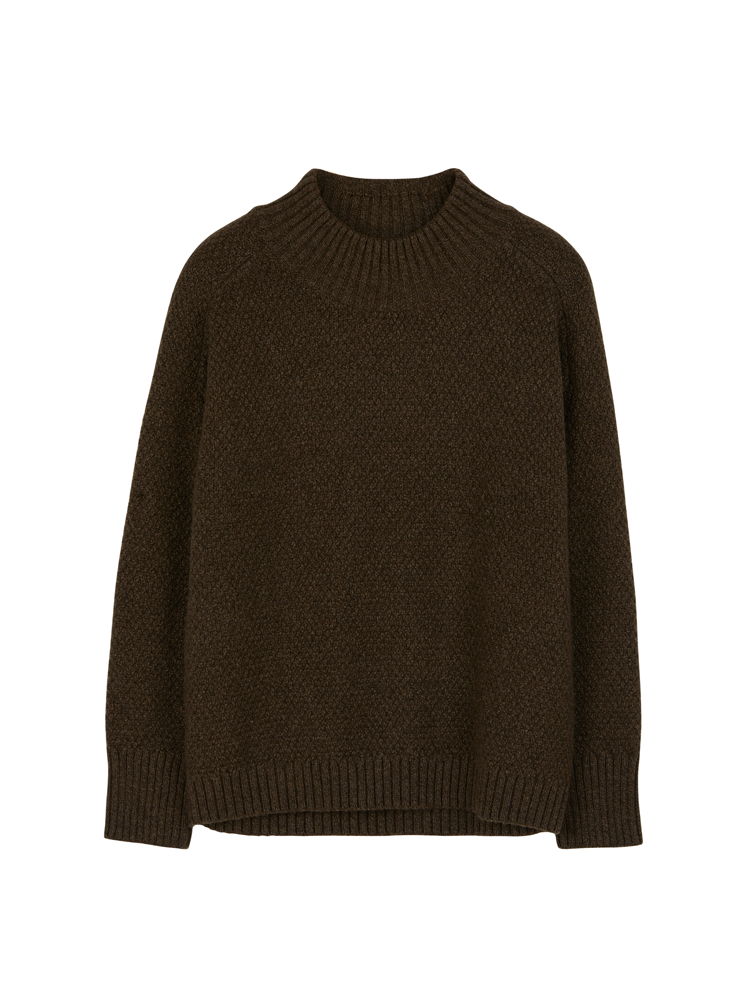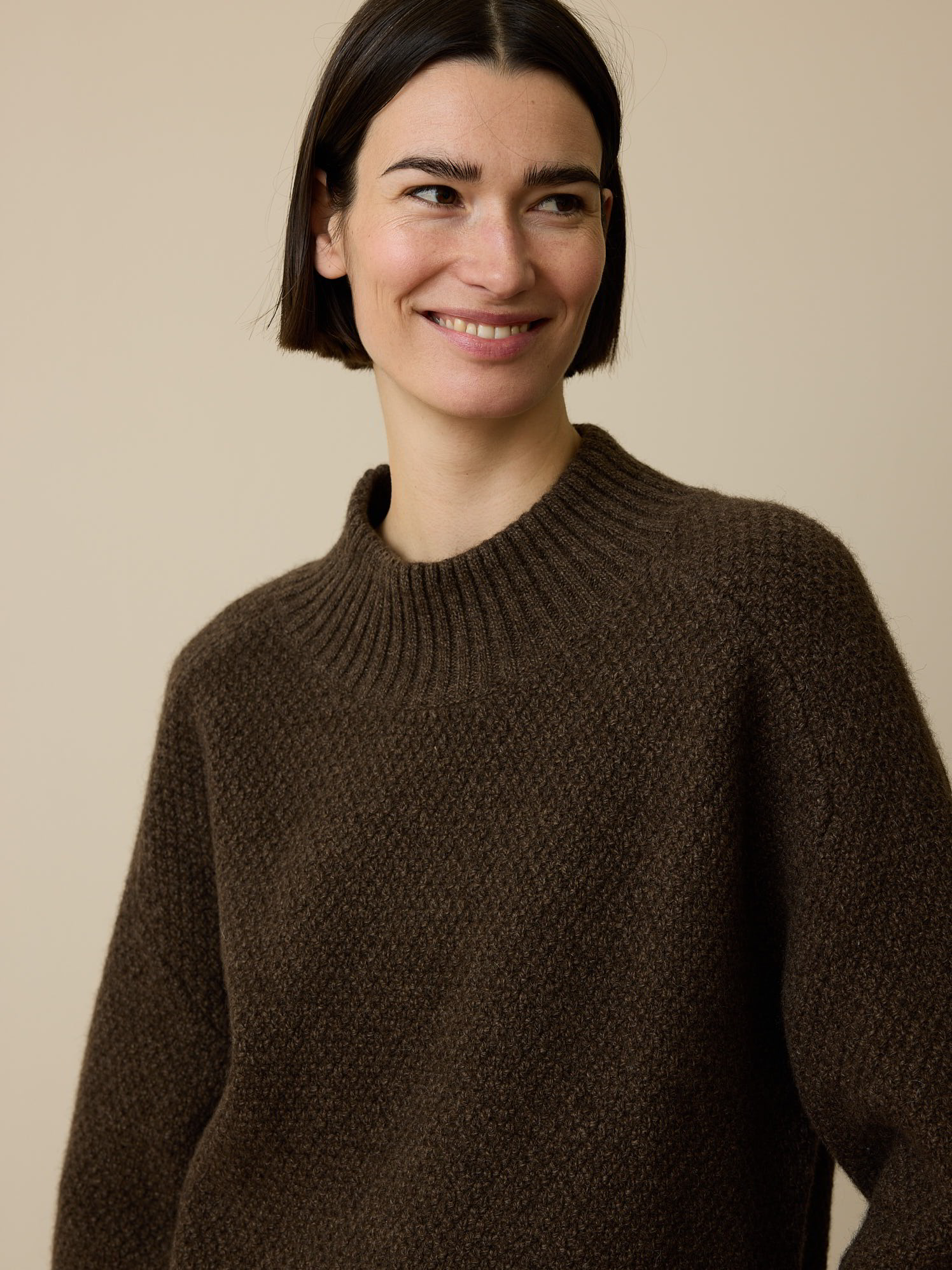 Einzigartig & wertvoll: Struktur, Verarbeitung, QualitätDieser ungefärbte Grobstrick-Pullover besticht neben der hochwertigen Verarbeitung und der unglaublich-weichen Haptik vor allem mit der zeitlos-schönen Perlfang-Struktur. Zwei ungefärbte Yakgarne werden kombiniert und es entsteht ein angenehmer Melange-Ton, der in der besonderen Strickart gut zum Vorschein kommt. Eine gerade bis weite Passform sorgt für geborgene Gemütlichkeit. Abgerundet wird das Modell mit dem hohen Kragen mit einer sehr schönen Verarbeitung entlang der Ärmellänge. Weitere Details: Bündchen am Saum und Ärmelsaum.Schnitt: oversize. In Größe S (36/38) ca. 66 cm lang. Unsere Models sind zwischen 175 cm und 177 cm groß und tragen Kleidergröße S.Ökologisch & fair produziertEin schönes Stück Natur, welches wir nur zu gern tragen. Dieses Kleidungsstück entsteht aus kostbarem Yakhaar und wird in größter ökologischer Sorgfalt bei unserem Partnerbetrieb gefertigt. Die gesamte Wertschöpfung bleibt im Land der Rohfaser – fair gegenüber Mensch, Tier und Natur. Um die Langlebigkeit des Naturproduktes zu erhalten, empfehlen wir einen sorgsamen und wertschätzenden Umgang im alltäglichen Gebrauch.Material: 100 % Yakhaar.Materialherkunft: Yakhaar aus der Mongolei. Gestrickt in der Mongolei. Gefertigt in der Mongolei. -