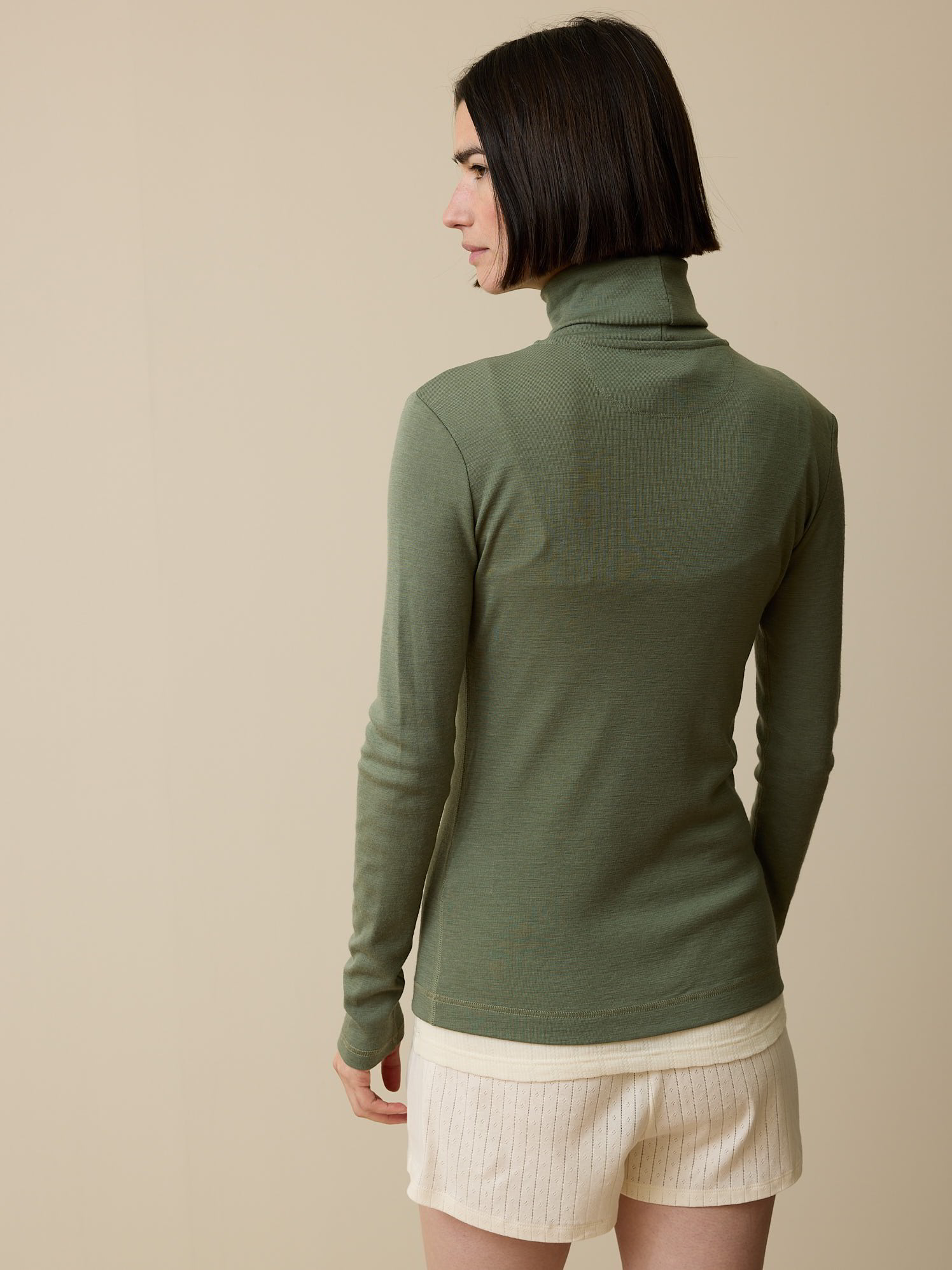 Rollkragen-Shirt aus hochwertiger Merinowolle: weich, temperaturausgleichend, anschmiegsam. Das Naturmaterial ist trageangenehm, wärmend und sorgt für ein leichtes Gefühl auf der Haut. Komplementiert wird der figurumspielende Schnitt mit einem Rollkragen und langen Ärmeln. Das Modell mit der sanften Melange-Optik ist ein zeitloser Allrounder – für zuhause oder unterwegs.