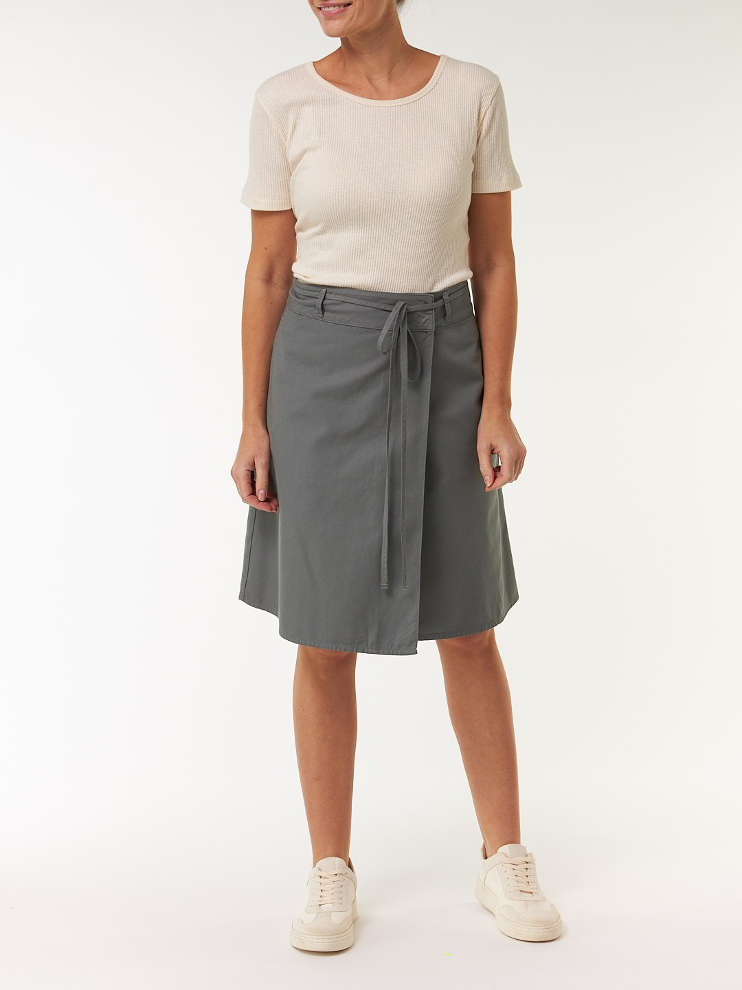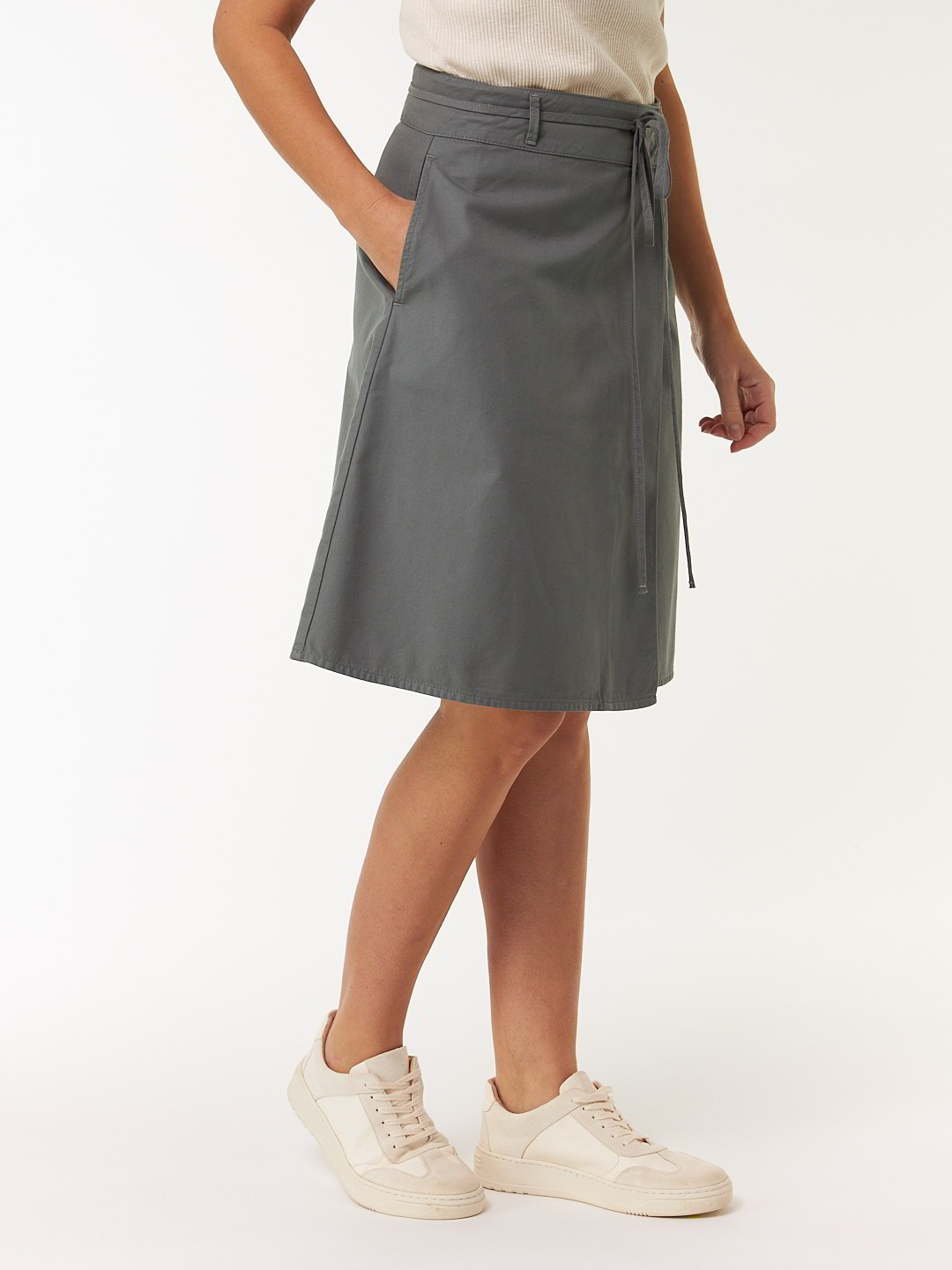Sportiver Wickelrock im Utility-Stil aus robuster Baumwoll-Qualität. Das Modell zeigt sich in feiner A-Linie mit klaren, funktionalen Details: Zwei seitliche Eingriffstaschen, Gürtelschlaufen, Bund mit Haken-Verschluss und Gegenknopf sowie ein zusätzliches, sehr feines Bindeband sorgen für sicheren Sitz und flexible Weite.