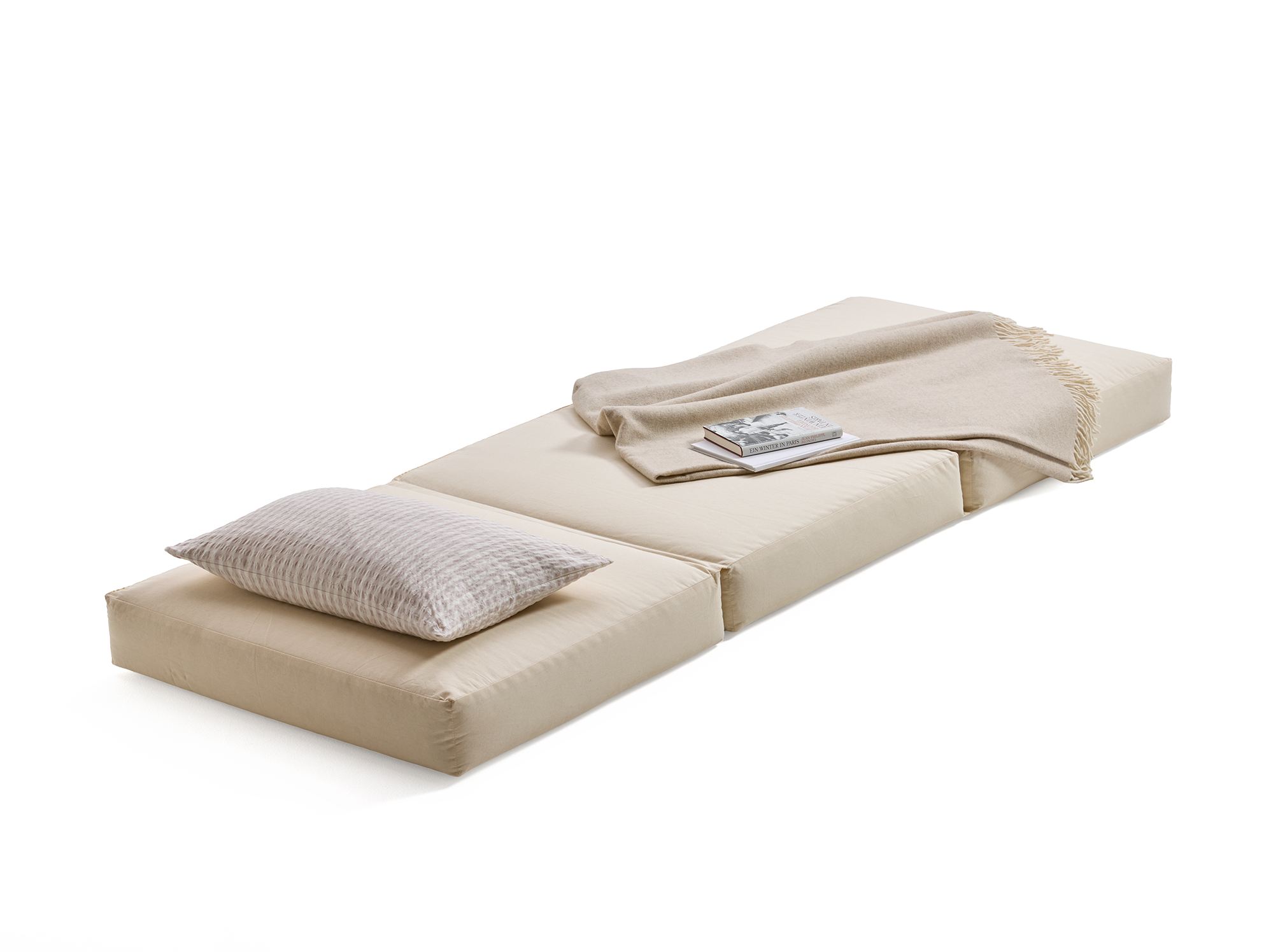 Tamu Pur ist ein komfortables Sitz-, Liege- und Wohnmöbel mit weichem, spielerischem, informellem Charakter: Zusammengeklappt dient der Hocker als All-Zweck-Sitzgelegenheit im Wohn- oder Kinderzimmer. Auseinandergeklappt ist er eine 201 x 75 x 13 cm große, komfortable Liege für den Tag bzw. eine Matratze für die Nacht.