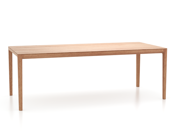 Auf der optisch schlanken, dabei konstruktiv sehr robusten Unterkonstruktion des Tisches ruht die großzügig dimensionierte, 2,5 cm starke Massivholzplatte. Verstärkt wird der beeindruckende Auftritt von Kilian durch die organische, leicht nach außen gewölbte Form der Tischplatte und deren in großem Radius abgerundeten Ecken. Im Randbereich ist die Platte an der Unterseite in flachem Winkel abgeschrägt, was sie zarter erscheinen lässt, als sie tatsächlich ist.