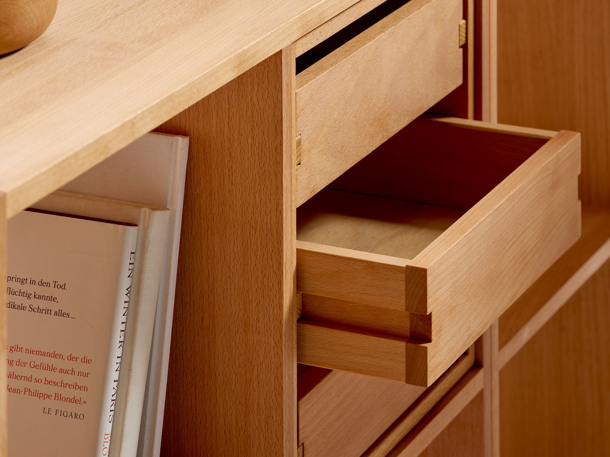 Das harte, kraftvolle und widerstandsfähige Buchenholz verlangt aufgrund seiner natürlichen Kraft viel Erfahrung und Fingerspitzengefühl bei der Verarbeitung. Durch das vorsichtige, schonende Dämpfen des – in frisch geschnittenem Zustand sehr hellen – Holzes im eigenen Saft bekommt die Buche eine zart hellbraune Tönung und nimmt durch die Behandlung mit natürlichem Öl eine kräftigere, an Zimt erinnernde Farbe an. Außerdem bewirkt der Dämpfprozess, dass das Buchenholz bei wechselnder Luftfeuchtigkeit (Sommer/Winter) deutlich weniger quillt und schwindet.-