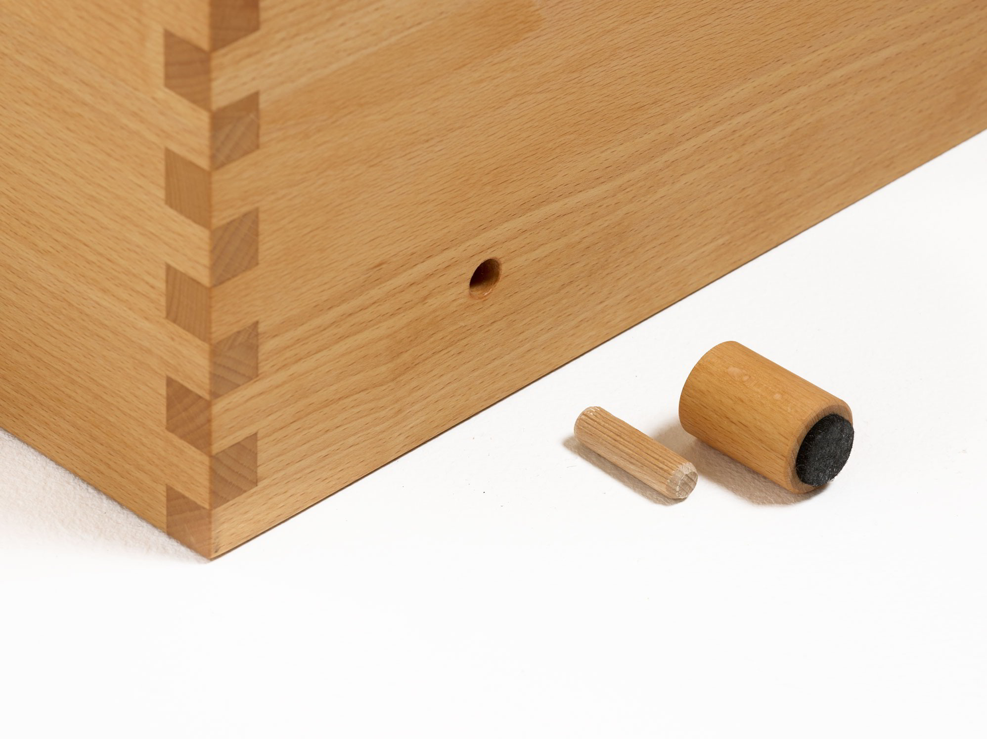 Füße zum Aufstecken (mit Holzdübel) in Buche oder Eiche – passend zur Box, Ø 2,5 cm, H 3,9 cm, mit Filzplättchen an der Unterseite zur Schonung des Fußbodens.