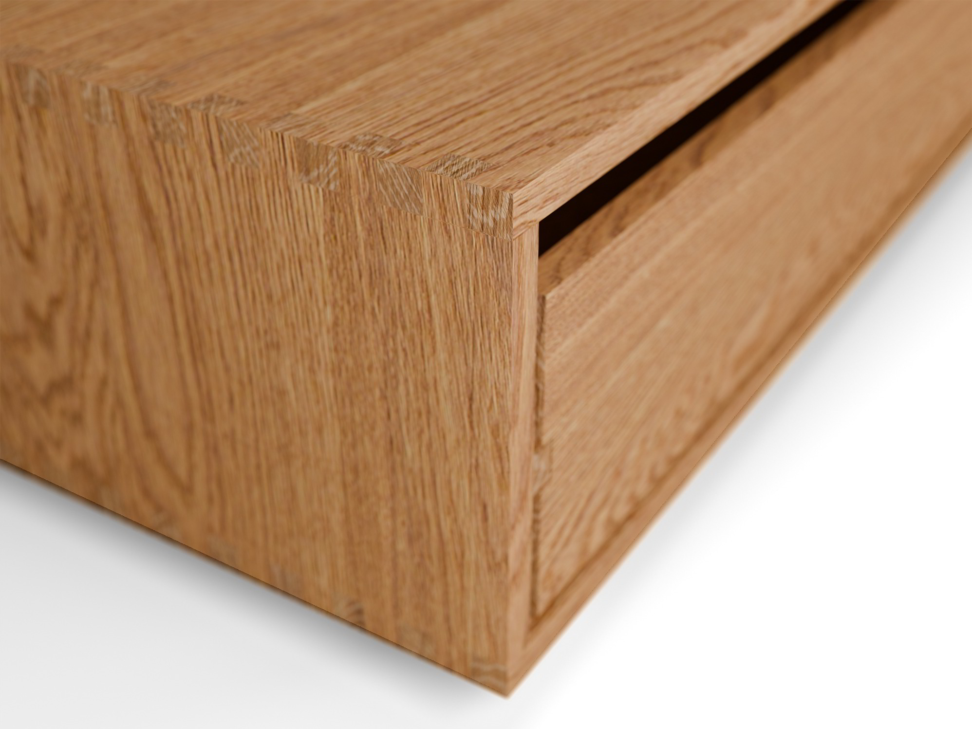 Jukai ist in Massivholz sehr stabil ausgeführt und mit optisch attraktiven, funktionell dauerhaften Fingerzinken als Eckverbindungen versehen. Aufgrund dieser Solidität kann der Tisch auch als informelle Sitzgelegenheit dienen.