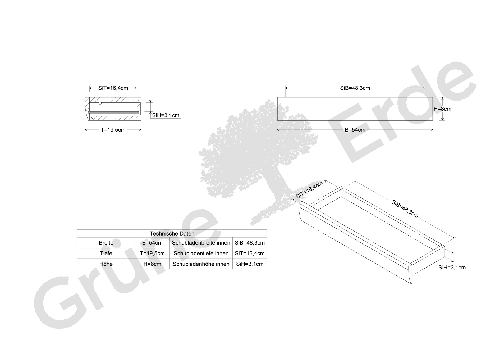 Lade Board Vela, für Bügel nach unten, B 540 x T 195 x H 80 mm, Bügel unten, Buche