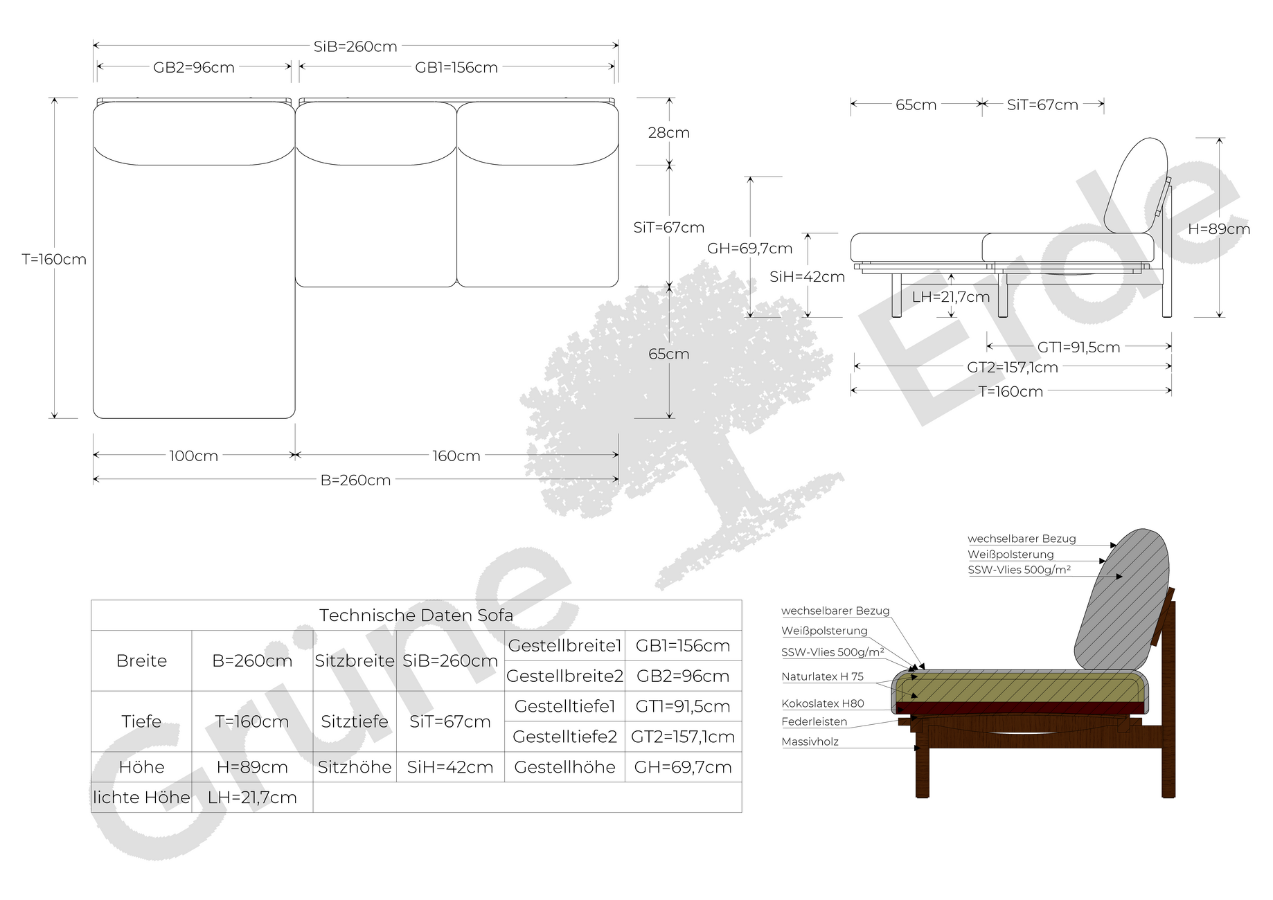 Massivholz aus nachhaltig bewirtschafteten Wäldern, handwerklich erstklassig verarbeitet; fixverleimte Dübelverbindung; von Hand geölte Holzoberfläche. Sandwichartig aufgebaute Polsterung bestehend aus fest-elastischem Kokoslatex, weichem Naturlatex und Schafschurwollvlies.-