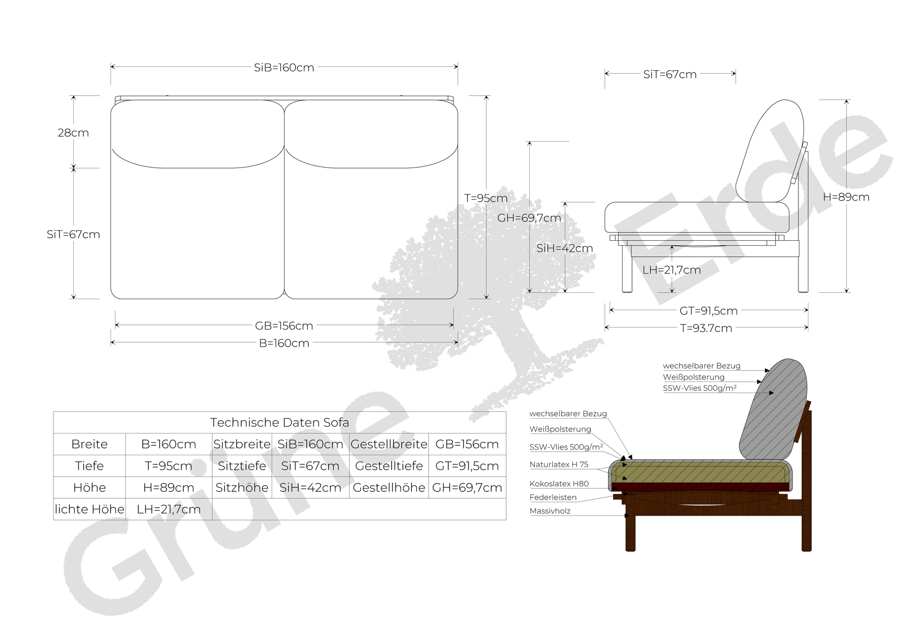 Massivholz aus nachhaltig bewirtschafteten Wäldern, handwerklich erstklassig verarbeitet; fixverleimte Dübelverbindung; von Hand geölte Holzoberfläche. Sandwichartig aufgebaute Polsterung bestehend aus fest-elastischem Kokoslatex, weichem Naturlatex und Schafschurwollvlies.-