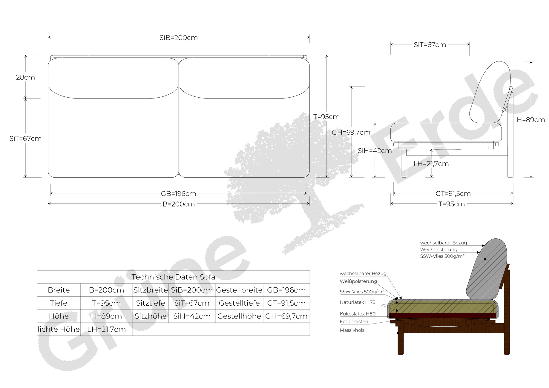 Massivholz aus nachhaltig bewirtschafteten Wäldern, handwerklich erstklassig verarbeitet; fixverleimte Dübelverbindung; von Hand geölte Holzoberfläche. Sandwichartig aufgebaute Polsterung bestehend aus fest-elastischem Kokoslatex, weichem Naturlatex und Schafschurwollvlies.-