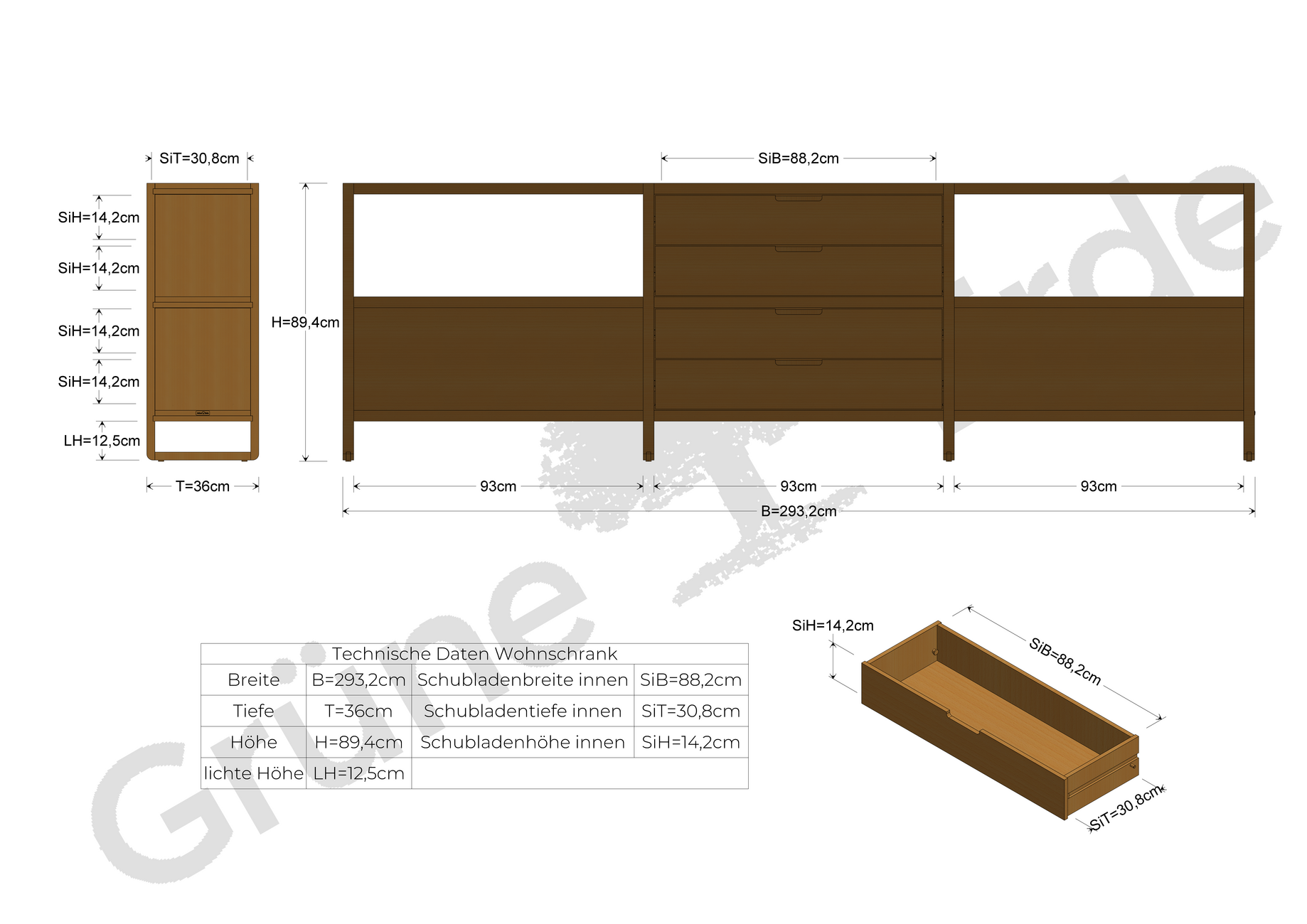 Die Quintessenz des RegalsystemsBücherregale, Side- und Highboards, Ladenschränke, Home Office-Einrichtung; in gleicher Höhe über die ganze Breite hinweg oder stufenförmig aufgebaut; im Wohn-, Schlaf-, Arbeits- oder Kinderzimmer: Quintum* ist ein modulares, flexibel einsetzbares, jederzeit neu gestalt- und erweiterbares Regalsystem für unendlich viele Möglichkeiten, Dinge des privaten oder beruflichen Alltags angemessen zu verstauen, schön zu präsentieren oder ungewollten Blicken elegant zu entziehen.Quintum ist zeitgemäß, optisch leicht und schlank gestaltet, gleichzeitig sehr stabil. Das Grundgerüst des Regalsystems bilden leiterförmige Seitensteher in 6 verschiedenen Höhen. An deren charakteristisch gebogener Unterseite ist eine für die Massivholztischlerei typische "Schlitz- und Zapfenverbindung" sichtbar.In diese Steher können verschiedene, jeweils 93 cm breite Module eingekoppelt und beliebig miteinander kombiniert werden: Schubladenmodule, Fachbretter, Module mit Schiebetüren aus Glas oder Holz. So lässt sich Quintum individuell gestalten. Man kann auch einen unserer 19 Konfigurationsvorschläge auswählen.Die Module sind ohne Werkzeug einfach ein- und auszubauen. Ganz im Grüne Erde-Stil werden die für Laden- und Schiebetürmodule notwendigen Seitenteile über einen Schubriegel-Mechanismus aus Massivholz mit den Seitenstehern verbunden – ebenfalls werkzeuglos!MaterialSeitensteher: Massivholz; Rückwände, Seitenwände: Schichtholz; Schiebetüren: Schichtholz oder Rauchglas. Quintum ist handwerklich erstklassig ohne Metall- und Kunststoffteile aus europäischem Holz gefertigt. Die Oberfläche wird von Hand mit natürlichem, lösemittelfreiem Pflegeöl eingelassen.*Quintum ist die Weiterentwicklung unseres früheren Regalsystems Quint.Hinweis: Die Elemente des (alten) Quint und des (neuen) Quintum sind nicht kombinierbar! -