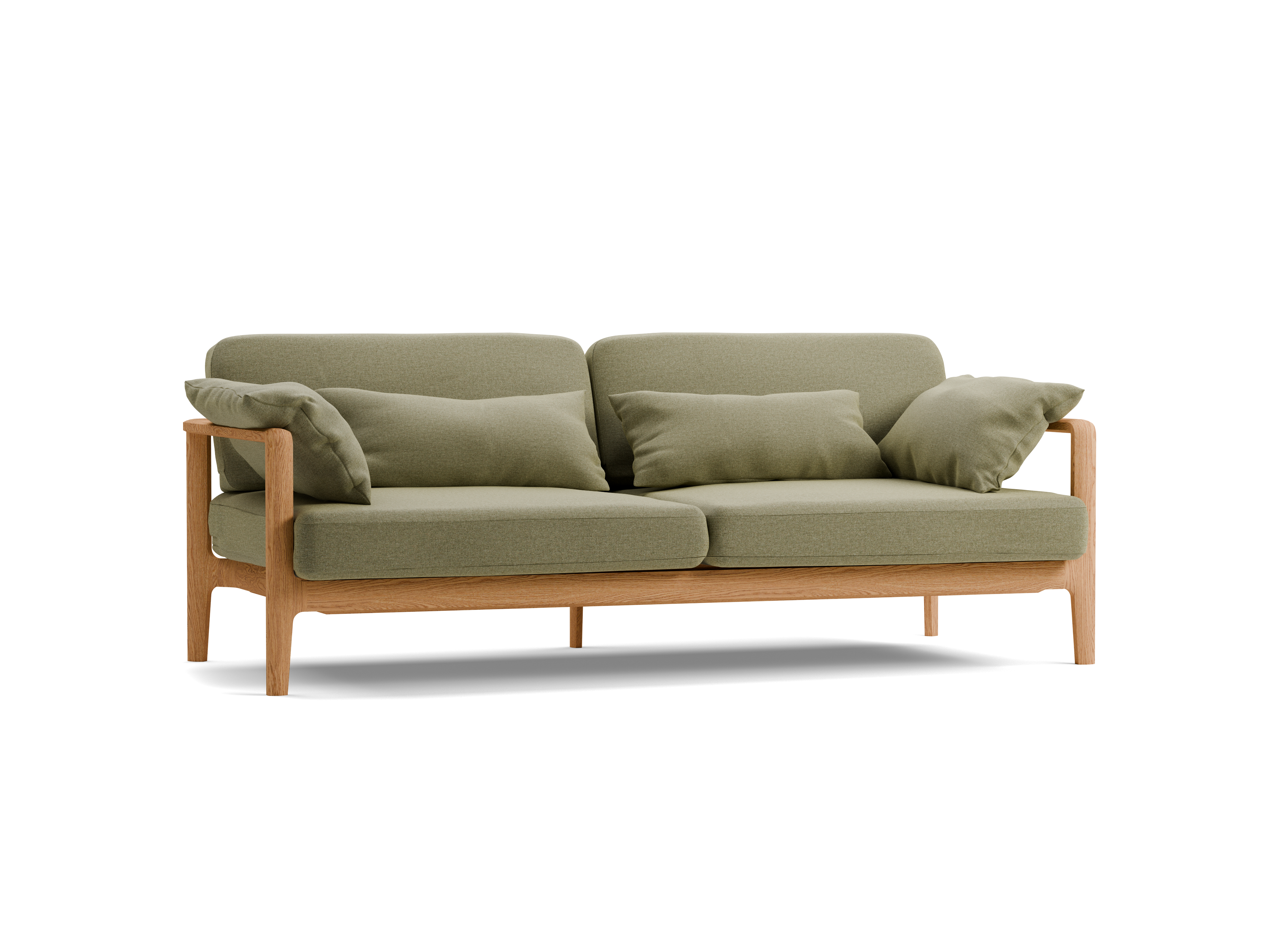Der elegante, schlanke, feinsinnige Sofarahmen aus fix verleimtem Massivholz – mit sanften, verrundeten, fließenden Übergängen und Verbindungen – umfängt die Polsterelemente relingartig und gibt dem Sofa auch eine reizvolle Rückenansicht.-