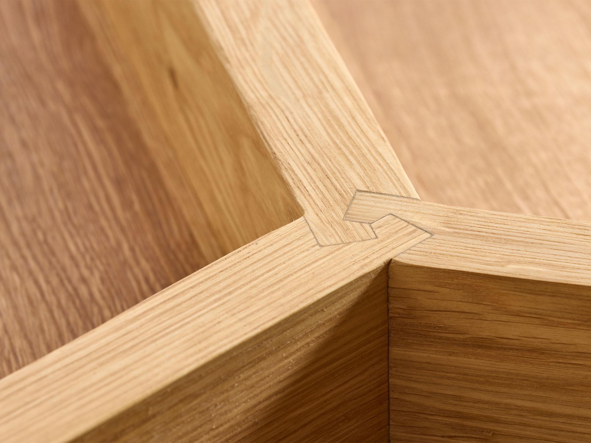 Die außergewöhnliche Konstruktion des Tisches ist auch am von uns entwickelten zentralen Verbindungsknoten des Fußgestells erkennbar: eine elegante, in sich selbst mehrfach verschränkte und verleimte, daher hoch belastbare Holzverbindung. Eine solche, vom traditionellen japanischen Tischlerhandwerk inspirierte, metallfreie Verbindung wird dem wertvollen Naturmaterial Holz am besten gerecht, ist technisch präzise und elegant.