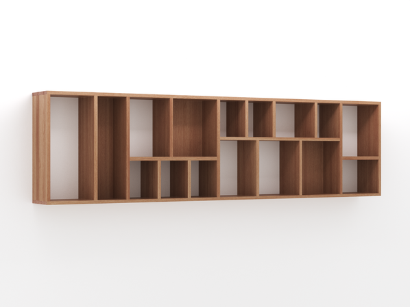 Das Wandregal sieht top aus und durch die wirre Anordnung der Fächer ist es schön ordentlich unordentlich. Das Eichenholz sieht echt gut aus und durch die unsichtbare Wandbefesttigung wird nirgendwo Platz eingebüßt.
