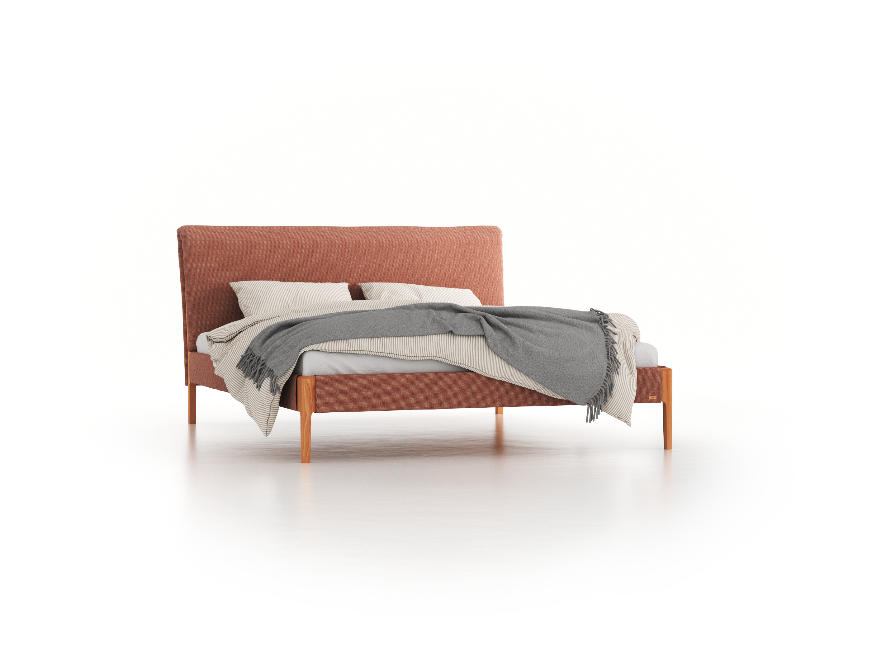 Bett Lorea mit Polsterbetthaupt, 180 x 210 cm, Wollstoff Elverum Ziegel (85), Buche