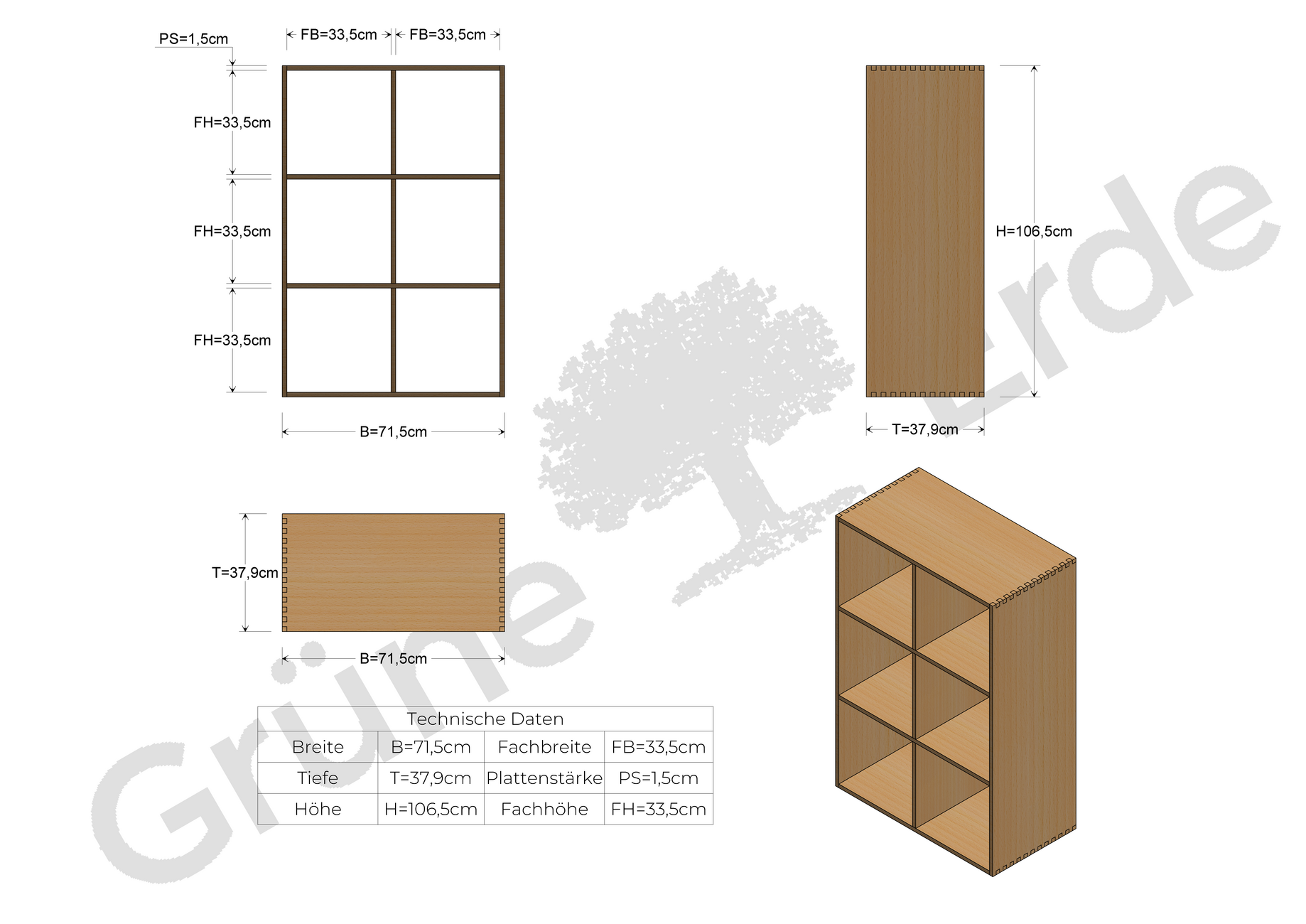 Regal Yunit Pur, B 71,5 x T 38 x H 106,5cm, 2 x 3 Fächer, Buche