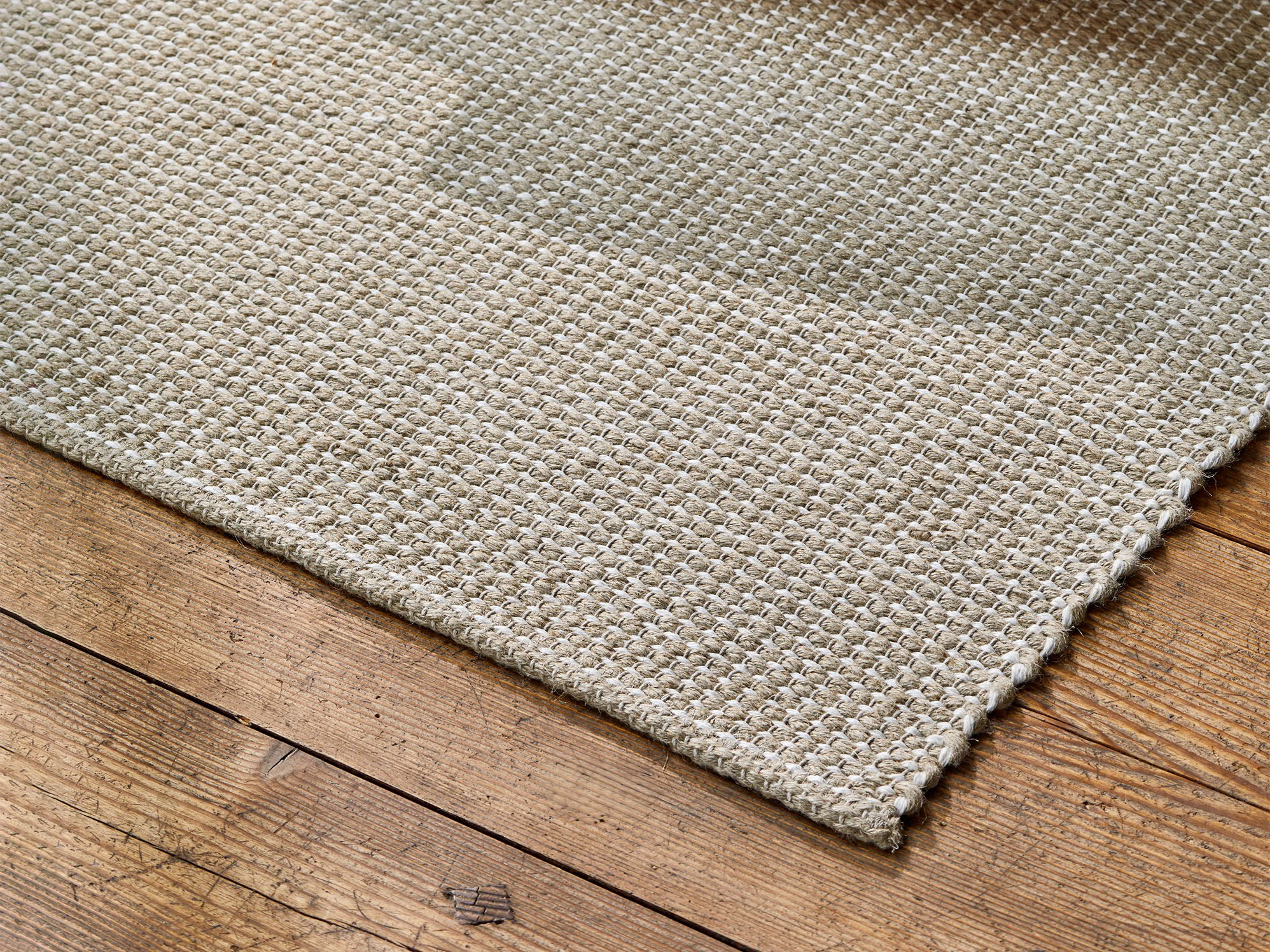 Für das Schussgarn dieses edlen, handgewebten Leinenteppichs wird zunächst ein feiner Zopf aus 3 Strängen geflochten. Beim Weben legt man dann zwischen den einzelnen Zopfreihen jeweils einen feinen Zwischenschuss in einer kontrastierenden Farbe ein. So entsteht eine reizvolle Hoch-Tief-Struktur mit klarer, graphischer Anmutung.