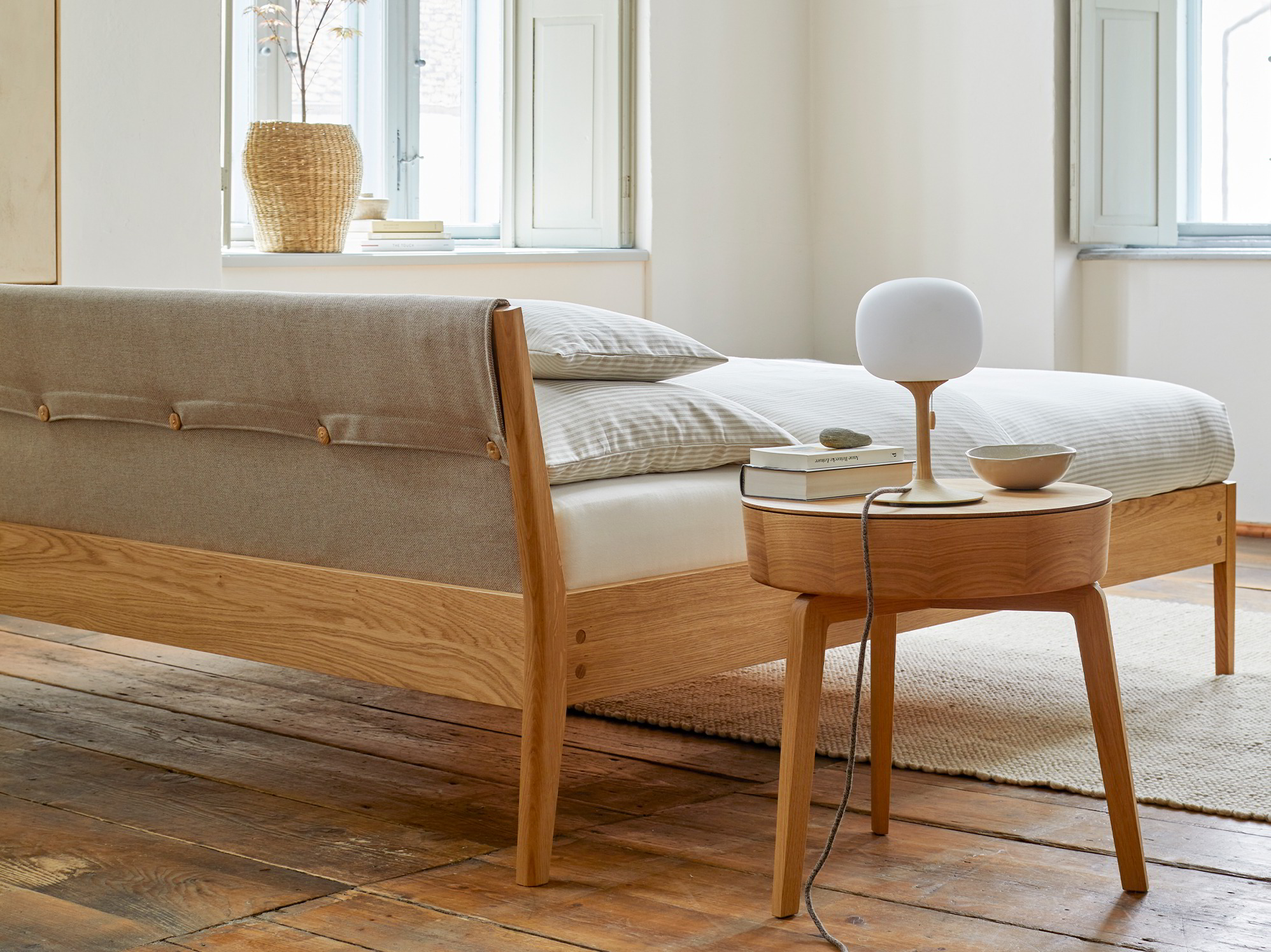 Dynamischer Schwung & hohe StabilitätDas stabile Betthaupt neigt sich sanft etwas nach hinten und bildet gemeinsam mit dem Bettfuß einen dynamischen Schwung. Es ist mit einer abnehmbaren, weich gepolsterten Housse ausgestattet. Diese fügt dem festen Material Holz eine weiche Komponente hinzu und lädt zum bequemen, knarzfreien Anlehnen ein, etwa beim Lesen oder beim abendlichen Gedankenaustausch mit dem Partner bzw. der Partnerin.Material & FertigungDas hochwertige, dauerhafte Massivholz für Almeno stammt aus mitteleuropäischen, nachhaltig bewirtschafteten Wäldern. Die Teile des Bettes werden von passgenauen, bei Bedarf wieder lösbaren Holzsteckverbindungen fest zusammengehalten. Dank dieser metallfreien Lasche-und-Dübel-Verbindungen lässt sich Almeno ohne Qualitäts- und Funktionsverlust wiederholt zerlegen und wieder zusammenbauen – ganz im Sinne der langen Nutzungsdauer des Bettes.Die Holzoberfläche ist von Hand mit duftendem, natürlichem Pflegeöl (lösemittelfrei) eingelassen. Zirbe bleibt vollständig unbehandelt, damit der charakteristische Duft dieser Holzart gut zur Geltung kommt.Die abnehmbare Betthaupt-Housse ist mit weichem Kokoslatex und Schurwollfilz gepolstert, mit dem NATURTEXTIL BEST-zertifizierten Schurwollstoff Ihrer Wahl bezogen und mit handwerklich sorgfältigen Nähten verarbeitet.Die Housse wird an Holzdübeln an der Innenseite des Bettrahmens befestigt, über das Betthaupt geschlagen und mit dekorativen Knöpfen aus Olivenholz verschlossen.Hinweis: Preis inklusive Aufstellservice, ohne Lattenrost, Matratze und Zubehör. -